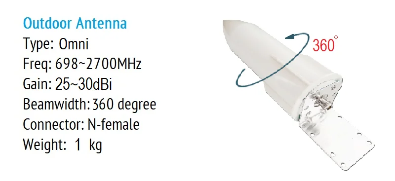 -Частотный диапазон:LTE/CDMA 850: 824 ~ 849; 869 ~ 894 МГц;GSM900: 890 ~ 915 МГц; 935 ~ 960 МГц;DCS1800: 1710 ~ 1785; 1805 ~ 1880 МГц;WCDMA 2100: 1920 ~ 1980; 2110 ~ 2170 МГц;LTE + 2600: UL:2500 ~ 2570;DL:2620 ~ 2690 МГц-Рабочий диапазон:BNAD 5 для 4G LTE + data или CDMA 95 voiceПолоса 8 для 2G GSM 2G голосаПолоса 3 для данных 4G LTEПолоса 1 для 3G wcdma UMTSПолоса 7 для 4G LTE + высокая скорость передачи данных-Усиление: 70 дБ.-Покрытие: 300 ~ 500 квадратных метров