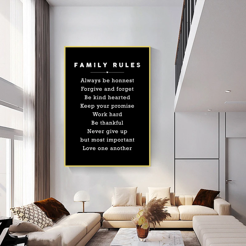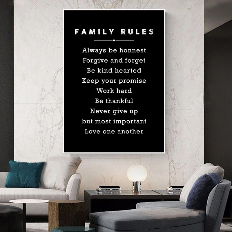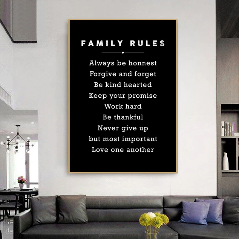 Мотивационная Картина на холсте семейных правил, черный вдохновляющий настенный постер-картина для гостиной, домашний декор