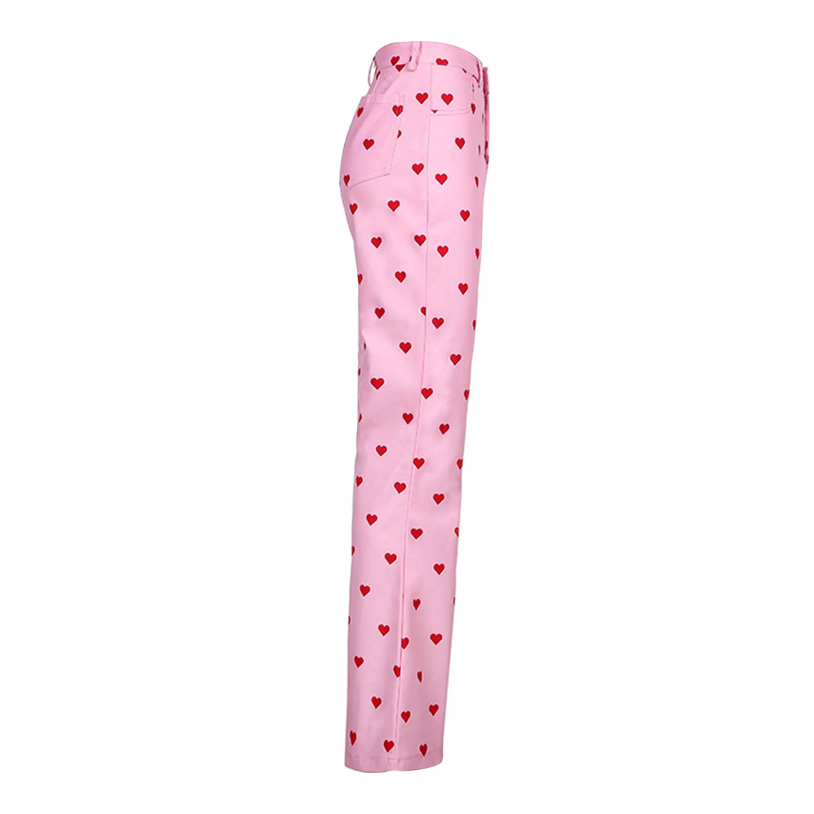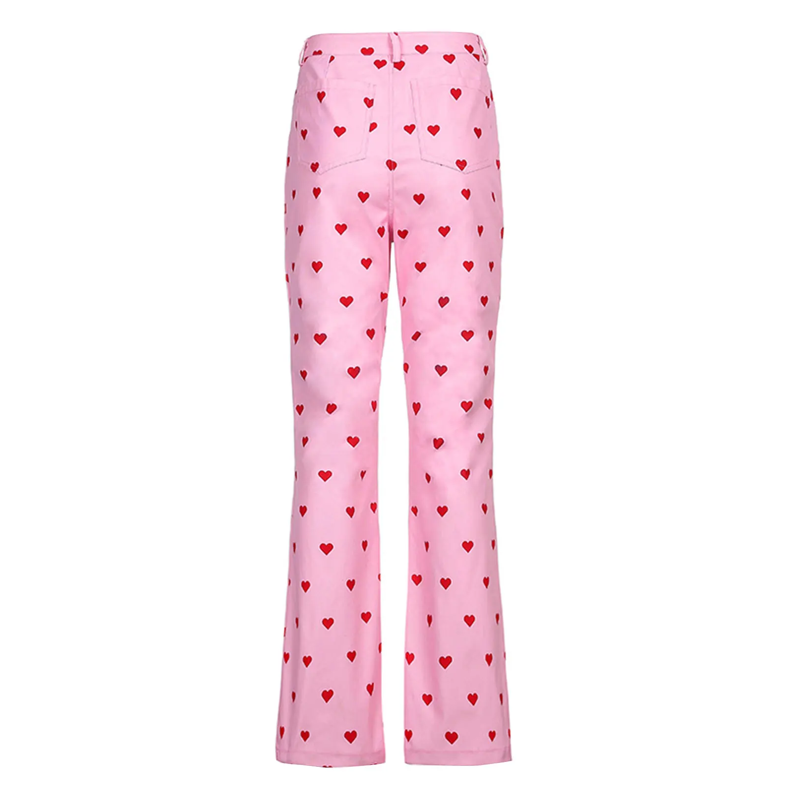 Брюки женские прямые с завышенной талией, модные розовые брюки-клеш с принтом сердечек, повседневные пикантные праздничные штаны, 2021
