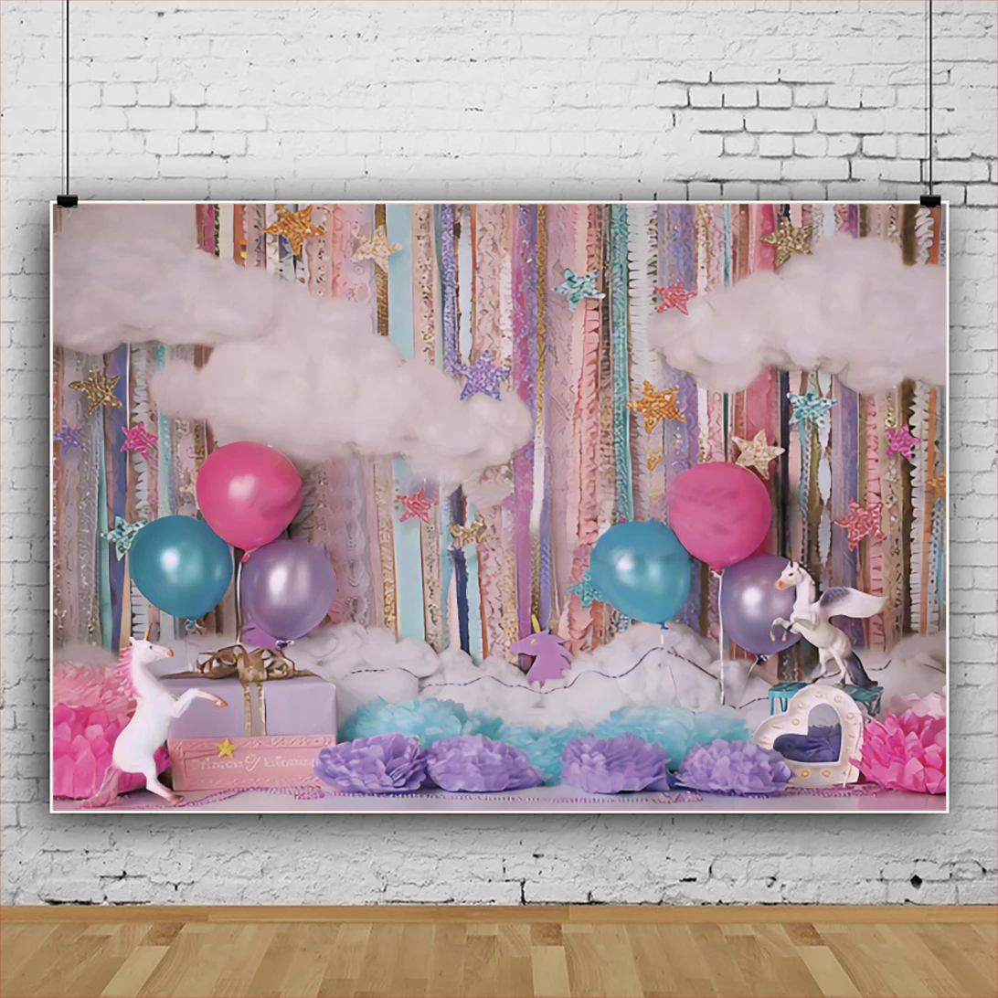 Laeacco День рождения с изображением Облака красочные бумажный шарик цветы Единорог детский фон для фотографирования новорожденных с изображением Фоны фотозонт