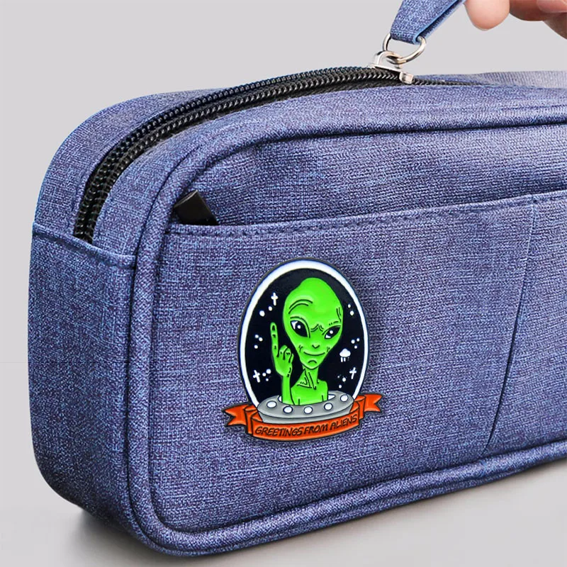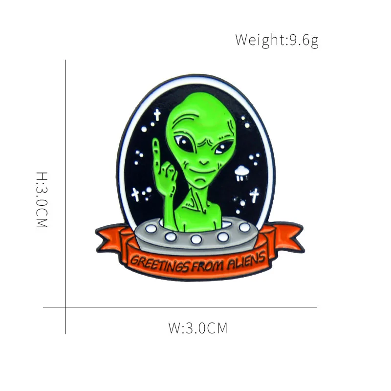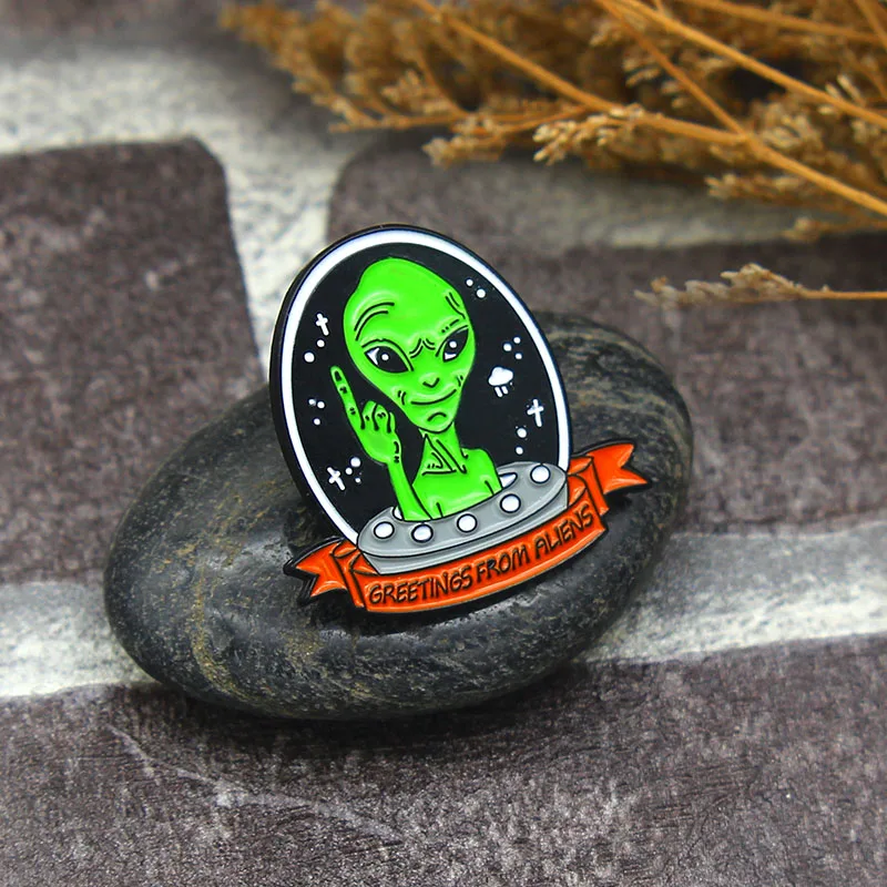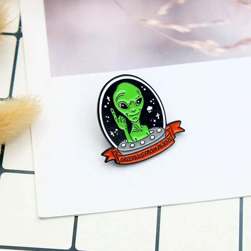 Эмалированные булавки Alien UFO с приветствием от пришельцев, броши с космосом, Вселенной, воздушным судном, космической жизнью, значки, ювелирные изделия, булавка, оптовая продажа