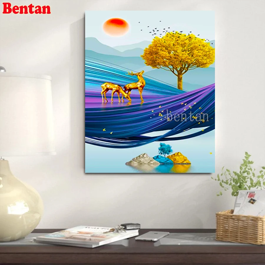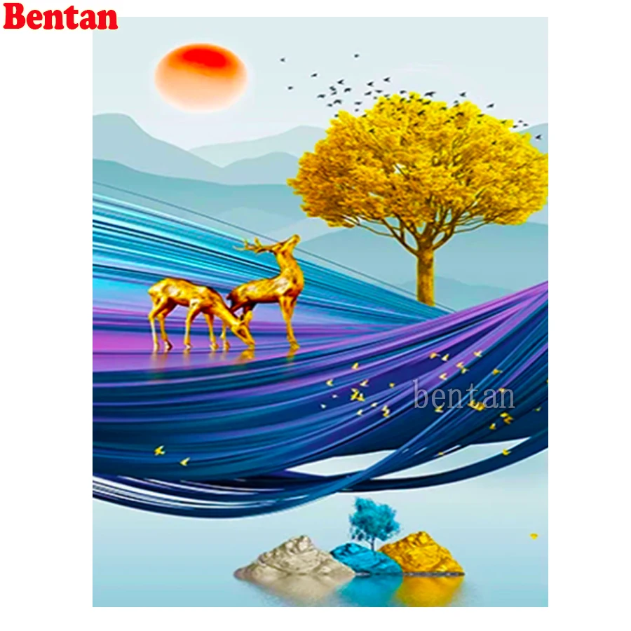 Алмазная живопись 5D, золотое дерево, олень, мозаика сделай сам, квадратная, круглая, стразы, алмазная вышивка, абстрактные линии, картины