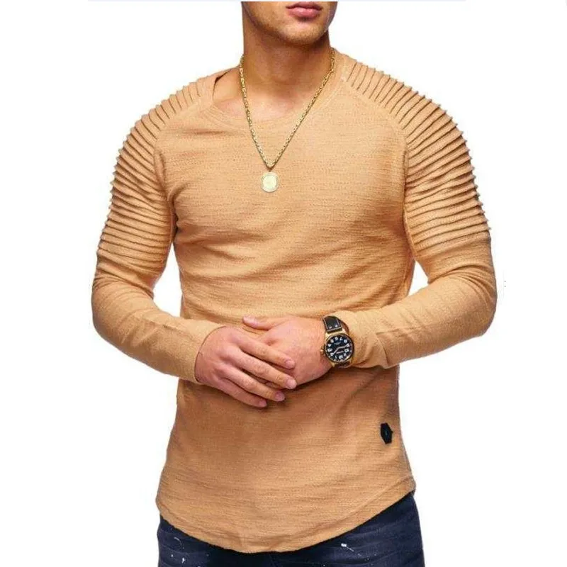 Футболка мужская однотонная с длинными рукавами, Модный облегающий базовый топ с плиссированными нашивками, Повседневная рубашка, весна 2020