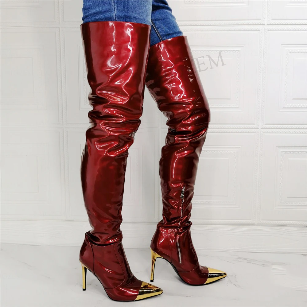 DOHBANER/женские Сапоги выше колена с эффектом металлик; Блестящие узкие сапоги на высоком каблуке; Женская обувь до бедра; Коллекция 2021 года; Большие размеры 42, 43, 45, 47