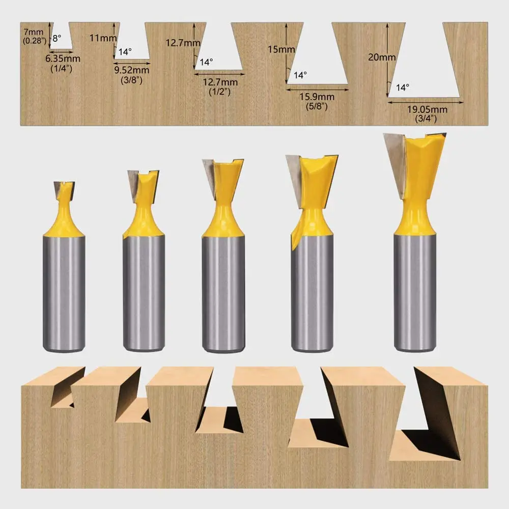 НАБОР КОНЦЕВЫХ ФРЕЗ Ласточкин хвостовик, комплект из 5 пазов 8 мм, 14 градусов, для работ по дереву, ящиков, ящиков, сундуков