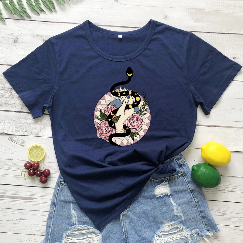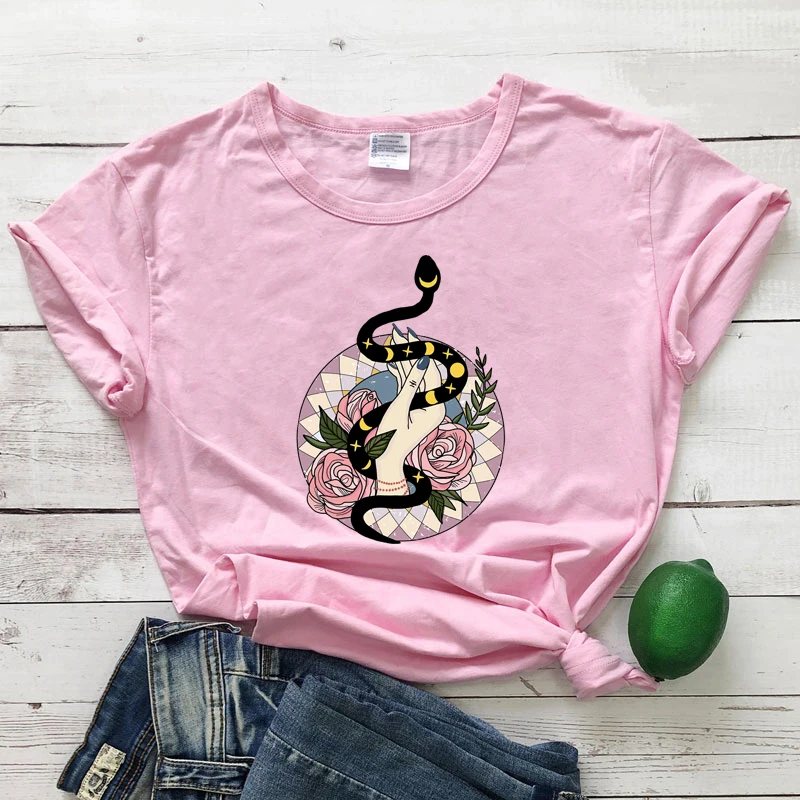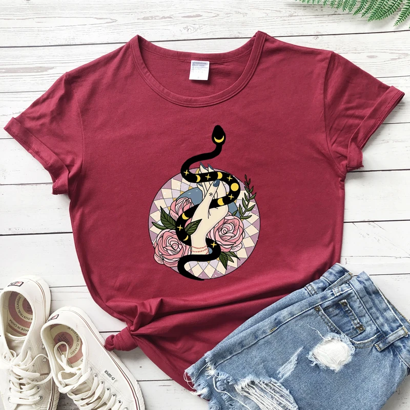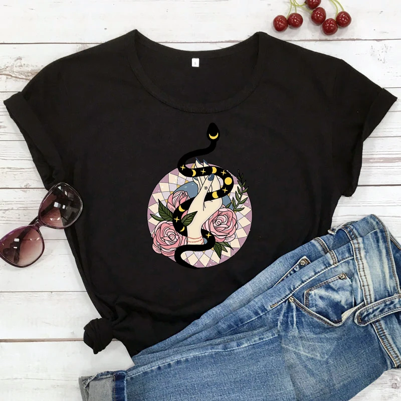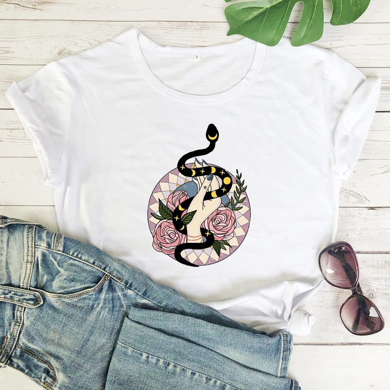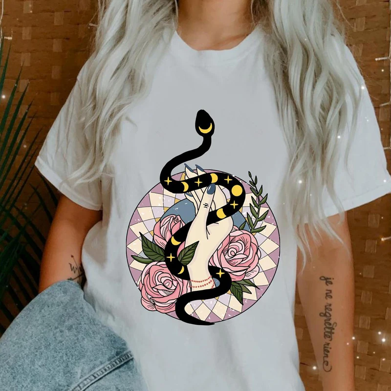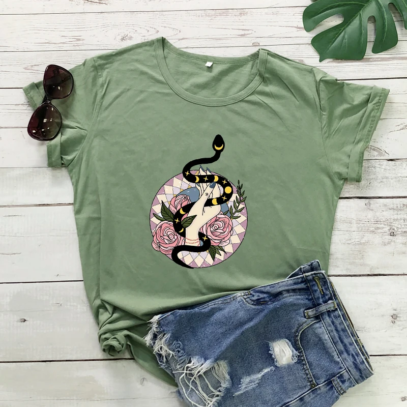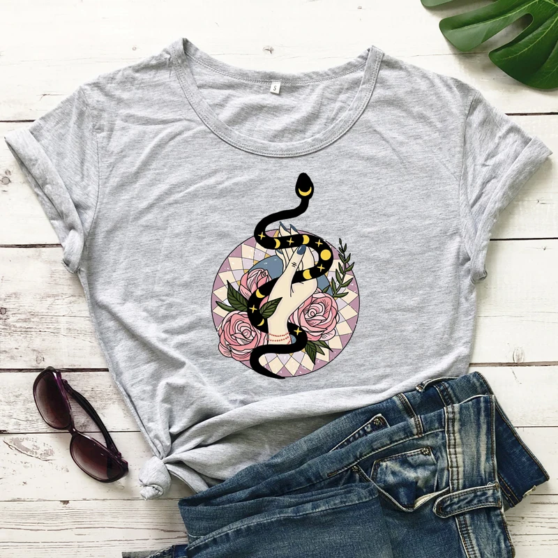Футболка женская в стиле бохо, Винтажная футболка с изображением фаз Луны, змеи в руке, духовной ведьмы, в готическом стиле