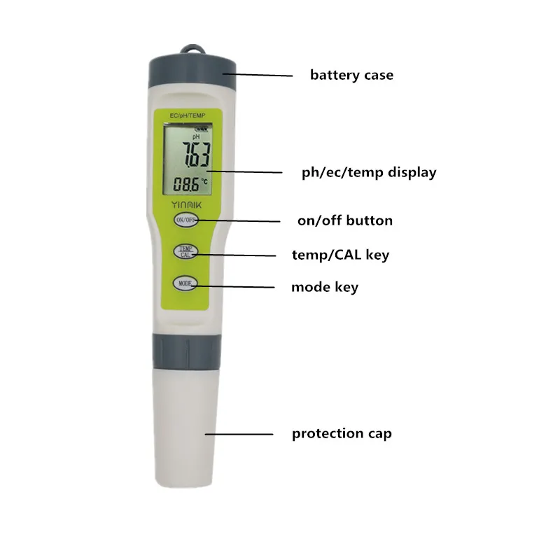 ►Калибровка: pH: автоматическая калибровка с тремя точками (6,86 & 4,00 & 9.18pH); EC: 1413 мкс/см