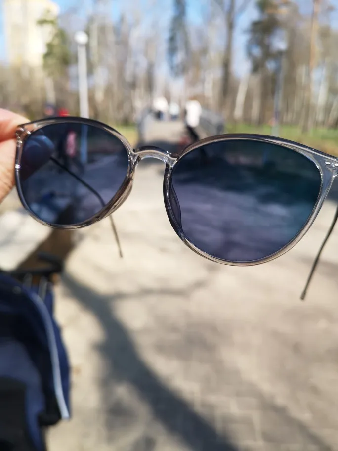 Доставка в Киев 2 недели! у меня лицо овал,- очки смотрятся норм! Стекло скорее серо-фиолетово-голубое (не как на фото у продавца). Очки лёгкие, оправа пластик, скобки метал. В комплекте идёт чехол с плащевки и салфетка. Продавца рекомендую!