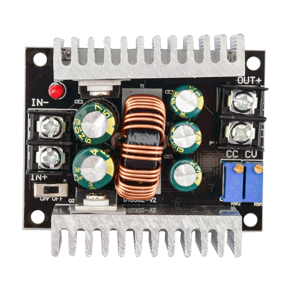 Особенности:С широким диапазоном входного напряжения от 6 В до 40 в, понижающий преобразователь может точно регулировать выходное напряжение и ток.КПД может быть до 96%, измеренная на 20A, преобразования 24 В до 12 В.Он разработан с 75V/80A большой ток двойной МОП-трубка.На входе и выходе используется высокочастотный низкоустойчивый электролитический конденсатор, низкая пульсация, стабильный выход.Проводка удобна с этими большими токами 30A винтовыми клеммами.Модуль buck имеет 2 теплоотвода, что может повысить теплоотвод.Если есть большая разница между входным и выходным напряжением, пожалуйста, уменьшите мощность и ток.Характеристики:Входное напряжение: от 6 В до 40 В постоянного тока (от 10 В до 40 в предлагается)Выходное напряжение: 1,2 до 36В постоянного токаВыходной ток: 20А (макс.), 15А (рекомендуется)Эффективность: 95%(24 В до 12 В, 20A)Выходная пульсация: ≤ 50 мВСпособ подключения: терминалЗащита от короткого замыкания: самовосстановление (не может долгое замыкание)Размеры: 60x53x27 мм/2,36x2,08x1,06 "(Д x Ш x В)VO +: выход положительныйVO-: Выход Отрицательный+ В: Входной положительный-Вход: отрицательныйCV: Регулировка выходного напряженияCC: Регулировка выходного токаRU: включить, низкий уровень напряжения выключить выход; Подвеска, высокий уровень напряжения является эффективнымКогда вход и выход являются обычным заземлением, без нагрузки CV выходное постоянное напряжение, CC выходной постоянный токПосылка включает:1x300 Вт 20A Регулируемый понижающий преобразователь постоянного тока понижающий модуль напряжения