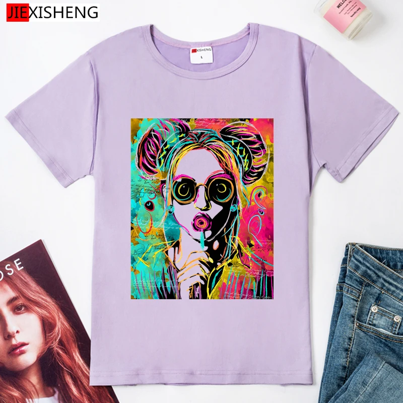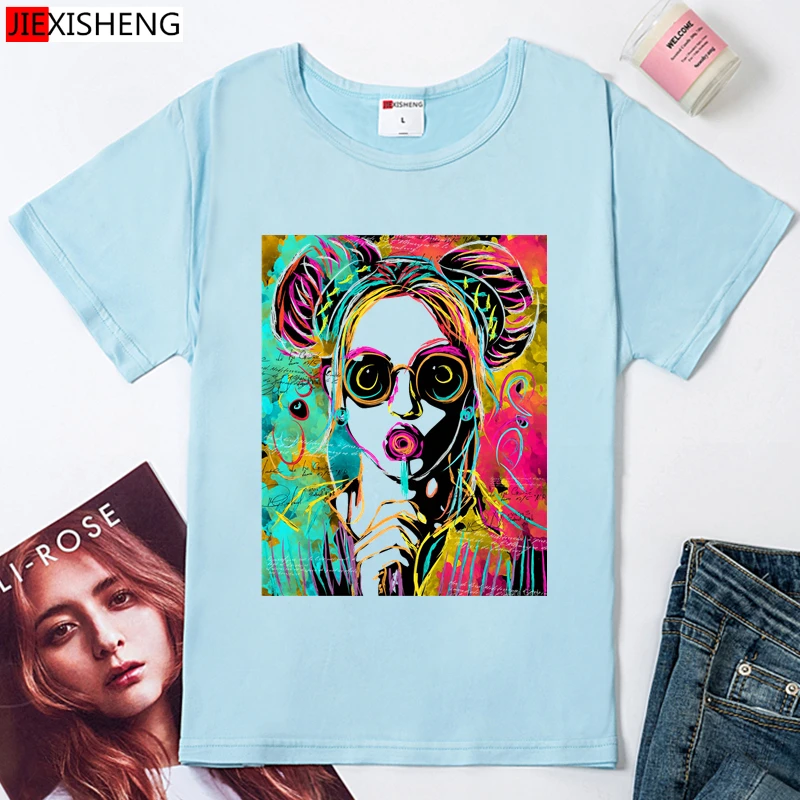 Женская футболка с принтом большого рта и кота, лето 5 видов цветов...