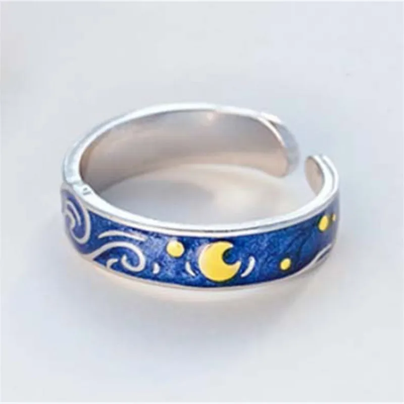 Роскошный бренд Ван Гог ночь открыто кольца для мужчин и женщин простой дизайн, серебристый цвет влюбленных синий звездное небо кольцо ювелирные изделия A946