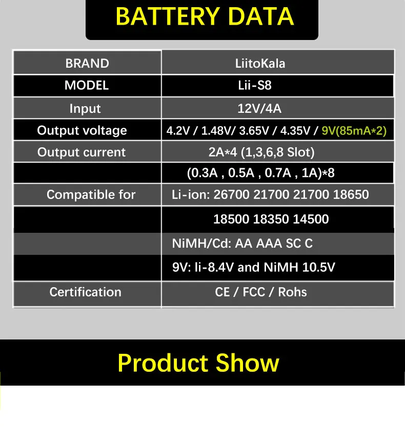 Напряжение: 110-240 В переменного тока до 12 В постоянного токаВходное напряжение: 12 В/4 а постоянного токаВыход напряжение: DC 4,2 V/1,48 V DC/DC 3,65 V / DC 4,35 V / 9VВыходной ток литиевая батарея зарядный ток: 2000ма * 4 / (300мА/500мА/700мА/1000мА) * 8 NiMH батареяЗарядный ток никель-металл: 500mA * 8 9В батареиЗарядный ток: 85 мА * 2 Аккумуляторная Батарея Характеристики: 26650,21700,18650,18350, 20650,14500, AA, AAA, C,SC 9V и т. Д. Метод прерывания: Интеллектуальный контроль напряжения Размеры: 195 мм (длина) * 142 мм (ширина) * 35 мм (высота).
