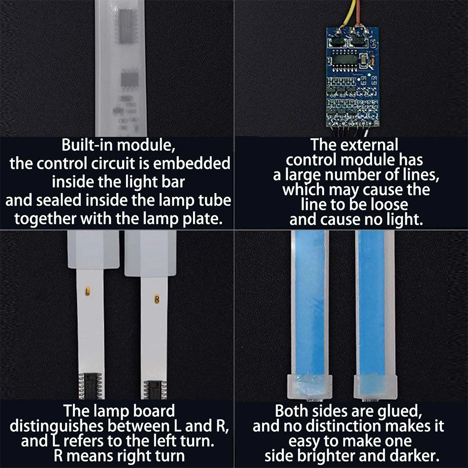 Эта лампа оснащена встроенным мини-модулем управления. Контроллер встроен в светильник. Запечатанный внутри трубки вместе с панелью лампы. Интегрированная ИС привода. Безопасный и сильный против помех. Сохраните место установки. Время запуска короче. Программа автоматически распознает алгоритм. Может достигать того же самого светильник при повороте. На плате есть логотип "L" "R", светильник. L относится к левому повороту. R означает правый поворот. Легко отличить.