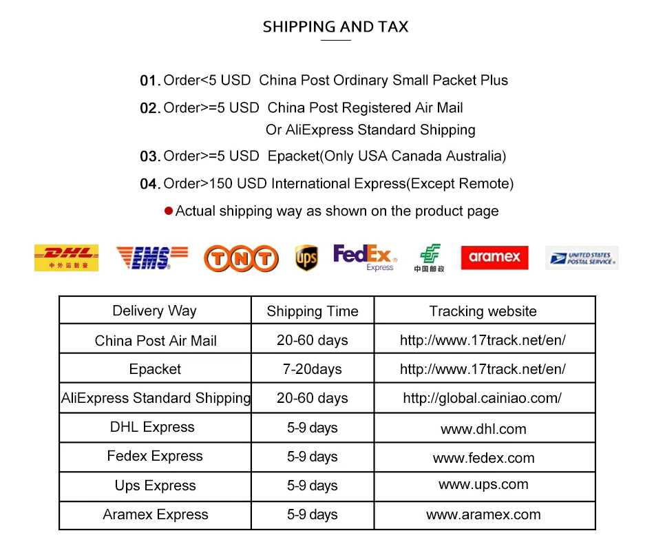 Доставка и доставка Все товары будут отправлены в течение AliExpress стандартного времени после получения оплаты. Товары отправляются из Китая авиапочтой, доставляются в большинство стран в течение 20-35 рабочих дней. Время доставки зависит от пункта назначения и других факторов, это может занять до 60 рабочих дней. Мы не несем ответственности за налог вашей страны условия оплаты мы принимаем Alipay здесь. Все основные кредитные карты принимаются через безопасный платежный процессор ESCRO гарантии и