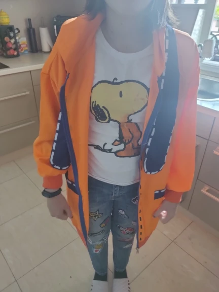 If ur buying this, please take a bigger size, im 147cm tall and i weight about 36kg (size s) , but still the jackets sleeves were almost too small, the lenght was good for me tho (i took the size l) the quality was the basic aliexpress quality on clothes (had some threads on the stitches, and the cloth felt cheap), they also send me a free gift (a cute key fob, and a wrist band) im satisfied with the order and its good for its price, i was a little suspicious when i bought this, because there isint many pictures of the jacket in the reviews.so i tried to add as many pictures of it as possible. Shipping was fast. I didint need to communicate with the seller.
