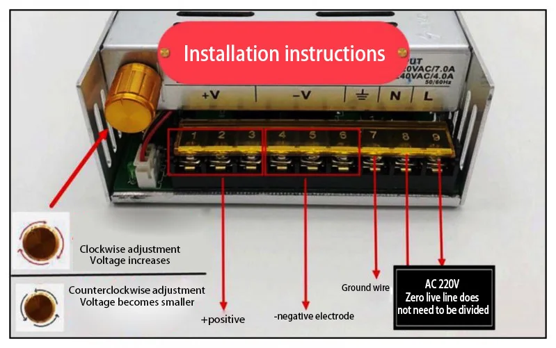 V-DC выход отрицательного терминала ADJ регулируемый потенциометр для тонкой настройки выходного напряжения постоянного тока