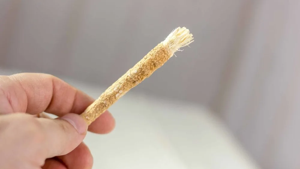 Кожура:Очистите наружный слой miswak примерно 1 см, чтобы показать внутренние щетинки.