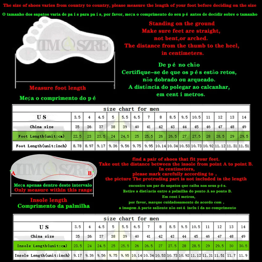 Метод один(Измерьте длину ступни): Убедитесь, что ступни прямые, не согнутые или арочные. Расстояние от большого пальца до пятки, в сантиметрах. Метод два(Измерьте внутреннюю длину): Найдите пару обуви, которая подойдет вашим ногам. Выньте расстояние между стелькой от точки A до точки B. В сантиметрах, Пожалуйста, отметьте внимательно в соответствии с изображением выступающая часть не входит в длину Измерьте оба способа измерения, результаты двух измерений должны соответствовать тому же китайскому размеру обуви
