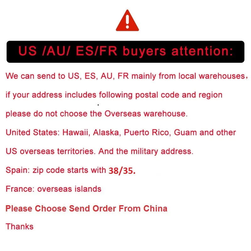 Внимание покупателя США:Области, где склад США не доставляет товары: Гавайи, Аляска, Пуэрто-Рико, ГУАМ и другие заморские территории США. И военный адрес.