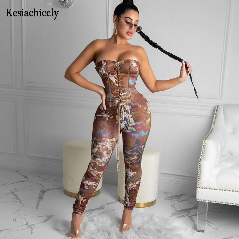 Сексуальный женский комбинезон Kesiachiccly с запахом и принтом, летние облегающие комбинезоны с открытыми плечами, боди 2021, женские новые комбинезоны для фитнеса на шнуровке