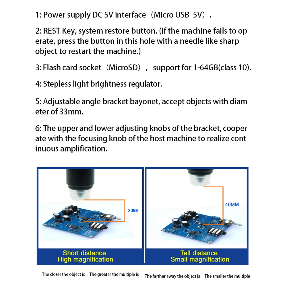 Особенности:Есть одиннадцать светодиодный светильник с обеих сторон, который может заполнить светильник и сделать наблюдение более четким.Многоцелевой: ремонт телефонов, проверка и пайка печатных плат, миниатюрный ремонт часов, сборочная линия, искусство и ремесла и так далее.Выберите материалы отличного качества, тело плотное и не легко сломать.Система поддержки: Windows XP, Vista, Win7/8/10, Mac10.5 и выше.Языки: упрощенный китайский, традиционный китайский, японский, английский, корейский, французский, итальянский, немецкий, испанский, русский.Два объектива имеют свои собственные применения: No.1 Объектив низкой мощности (500x), подходит для технического обслуживания и осмотра монтажной платы, печати инспекции, jades и идентификации драгоценных камней и т. Д. No.2 объектив высокой мощности (2000x), подходит для микробного наблюдения, наблюдения за секциями, наблюдения за вредителями растений и болезнями и т. Д.Функция: двойной светодиодный светильник, может делать фотографии или видео, поддерживает TF карту памяти, аккумулятор большой емкости, Двойной источник питания, адаптируется к большему количеству сценариев.Поддержка просмотра экрана компьютера, наблюдение четче, яркая краска на металлической поверхности, ощущение тонкой руки, нескользящая ножная накладка внизу, наблюдение более стабильное.Характеристики:Материал: АБС + металлПиксель: 12 миллионов пикселейРабочая высота: 0 ~ 60 ммУвеличение: 0 ~ 2000xРежим фокусировки: ручной фокусДиапазон фокусировки ручки: 2 мм ~ 55 ммФормат изображения: JPGФормат видео: MOVРазрешение изображения: 1920*1080pРазрешение видео: 1920*1080PАккумулятор: 1 * литиевая батарея, 2600 мАч (в комплекте)Время работы: 2 часаВремя зарядки: 3,5 часовРазмер посылка: 275*220*160 мм/10,8*8,7*6,3 дюймовПосылка Вес: 1400 г/3.1lbУпаковочный лист:1 * микроскоп2 * USB кабель2 * биологическая секция1 * салфетка для очистки1 * Руководство пользователя1 * No.1 объектив1 * No.2 объектив1 * подъемный кронштейн