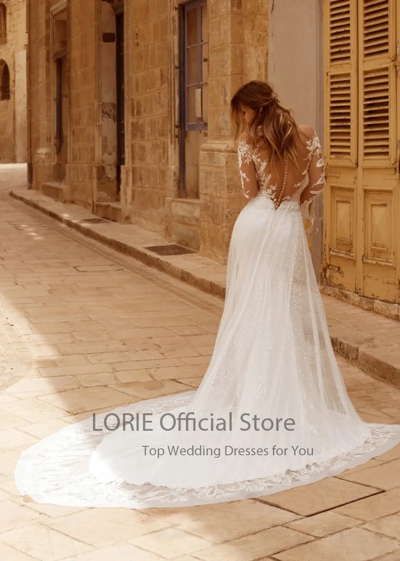 Блестящие Свадебные платья LORIE в стиле бохо с юбкой-годе, кружевным круглым вырезом и длинными рукавами, эластичное шифоновое белое свадебное платье в стиле кантри, свадебная одежда