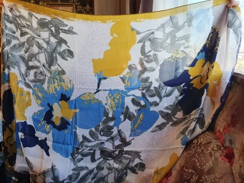 Шарф шёл три недели. Получила на почте. Снача немного расстроилась, достав его из пакета, так как все же он отличается от фото. Сиреневый цвет скорее ближе к серому. Не такой яркий. Но накинув на себя, все же решила, что так тоже неплохо смотрится. Очень нежный на ощупь. На бирке указано 100% шёлк и полиэстер, как так может быть, не понятно . Воздушный, лёгкий и приятный шарф.
