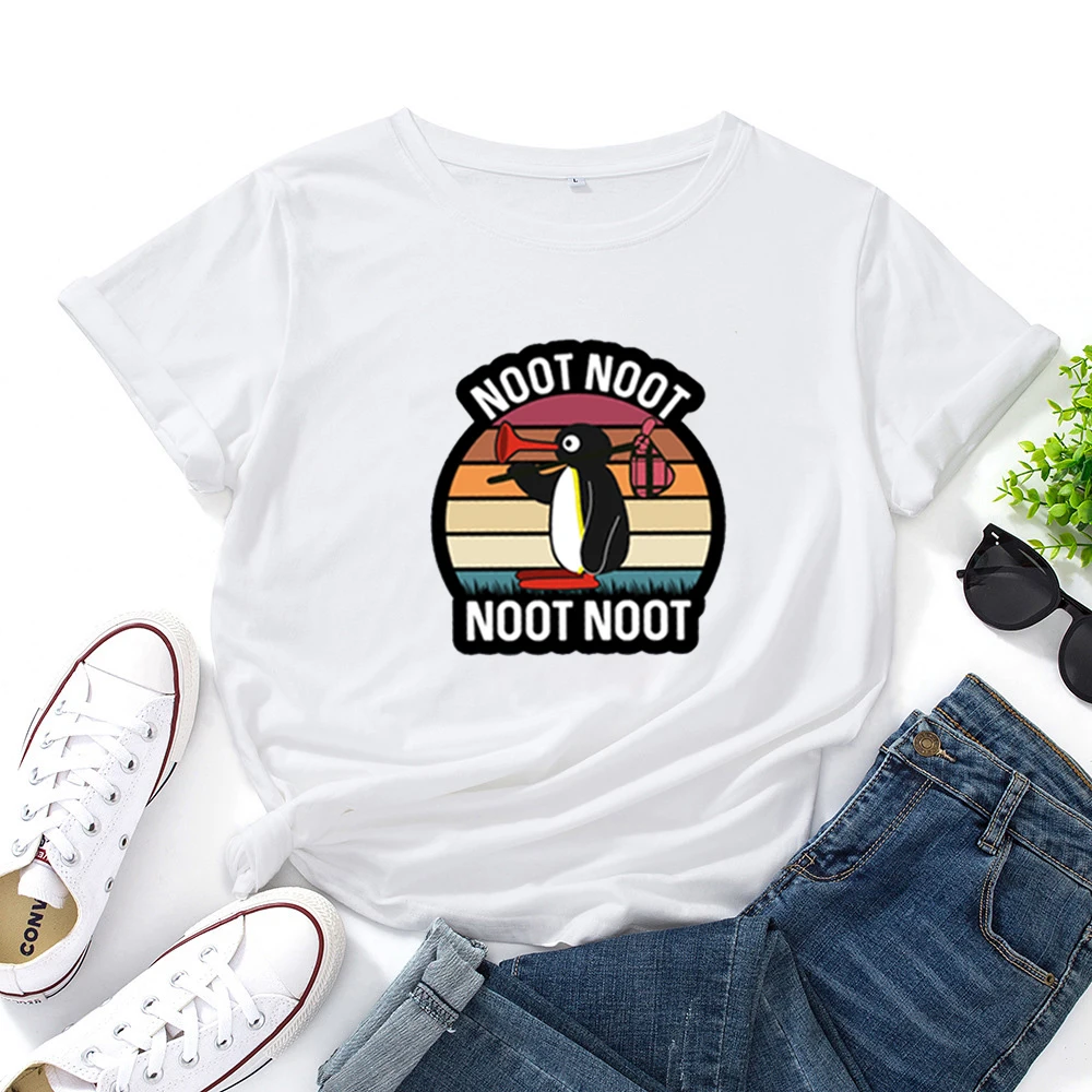 Футболка NOOT с рисунком пингвина из мультфильма, Женская хлопковая футболка с коротким рукавом и графическим рисунком, женская модная свободная футболка с круглым вырезом для женщин