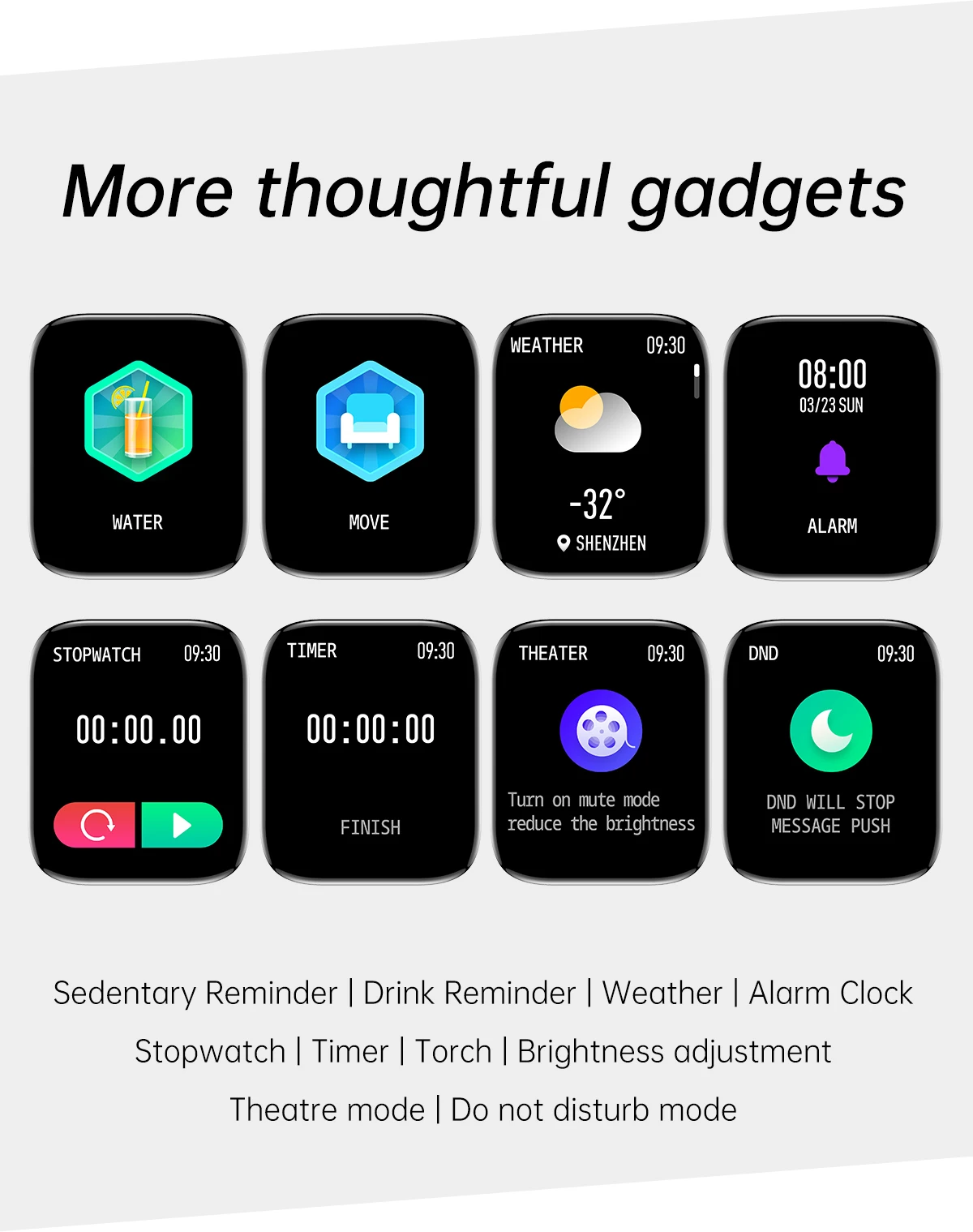 Прием/отклонение телефонных звонков/телефонных звонковМониторинг сердечного ритмаМониторинг кровяного/кровяного давления кислородаМониторинг снаНапоминание о сидячем положенииСпортивный шагомер/потребление калорий/Запись трека/время упражненийНапоминание о звонке и отображениеСообщение толкается и отображаетсяКамера дистанционного управленияАвтоматическое Измерение частоты сердечных сокращенийМульти-спортивные измеренияНапоминание о часахНапоминание о тревоге