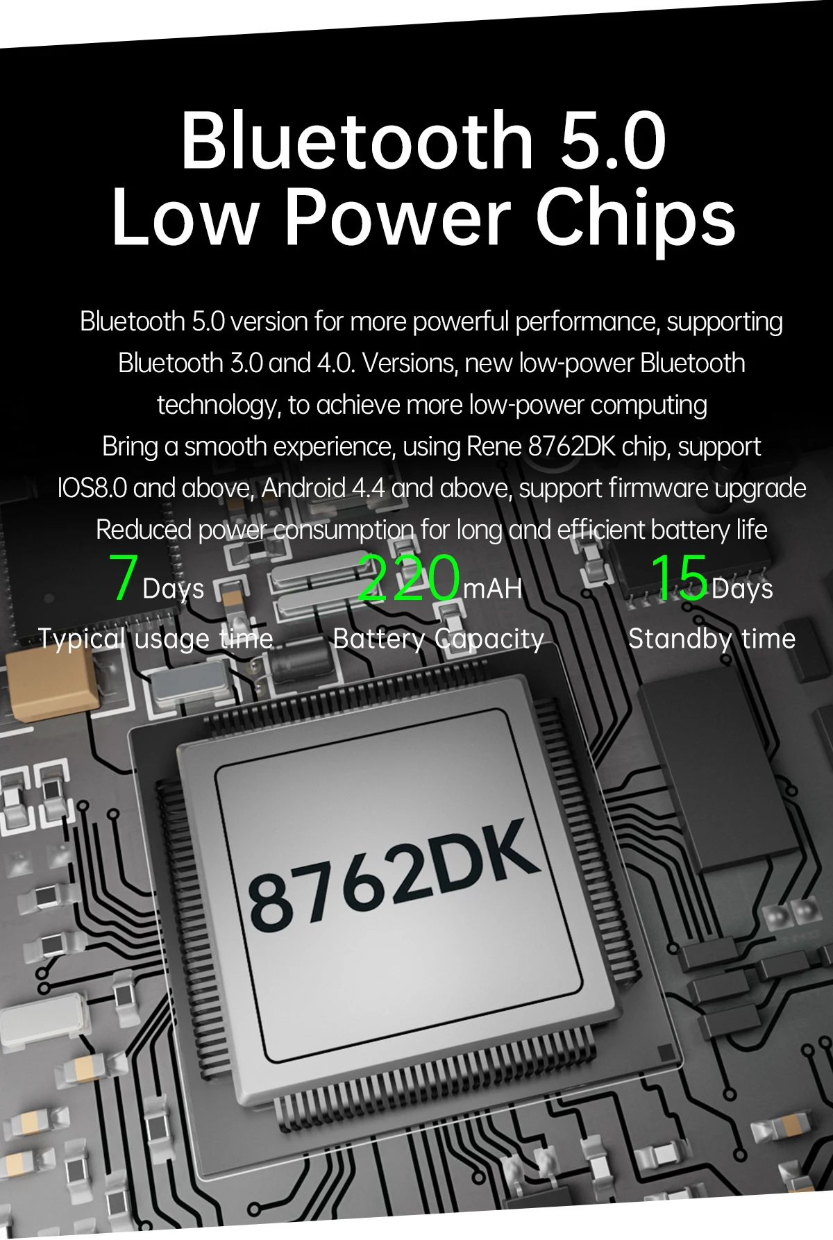 Набор микросхем: RTL8762DK + JIELIДатчик ускорения: SC7A20Емкость аккумулятора: 220 мАПоддержка телефонной системы: Для IOS8.0 и abocve, для Android5.0 и выше