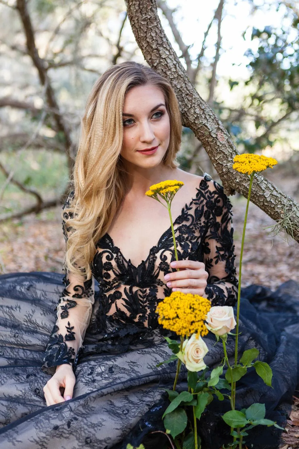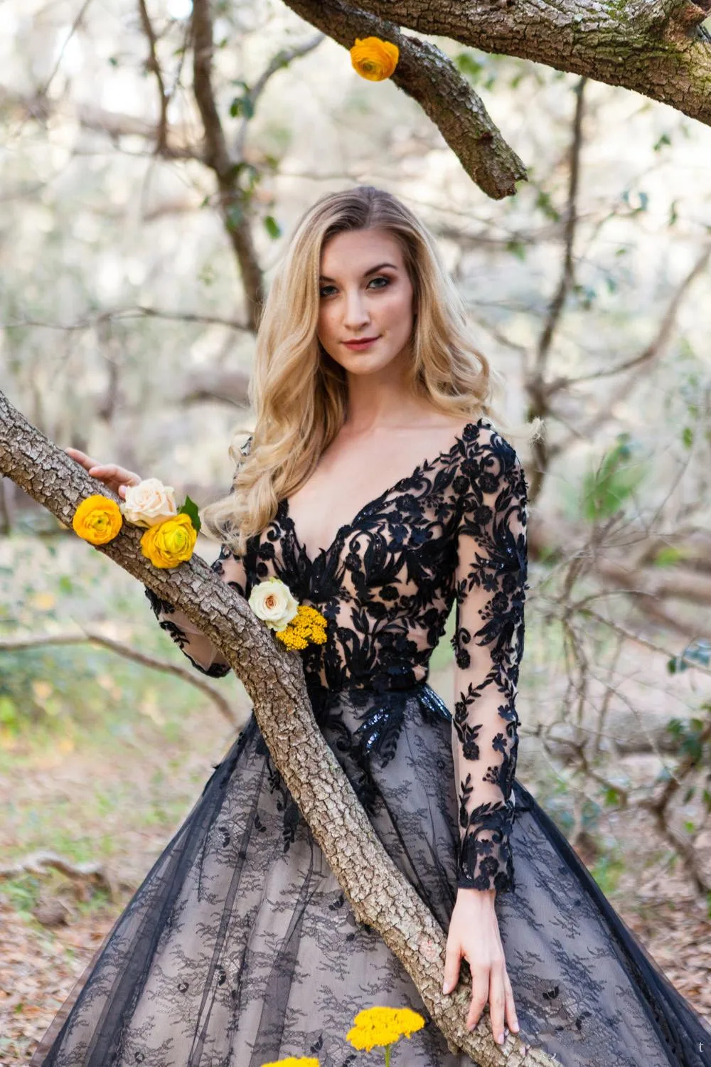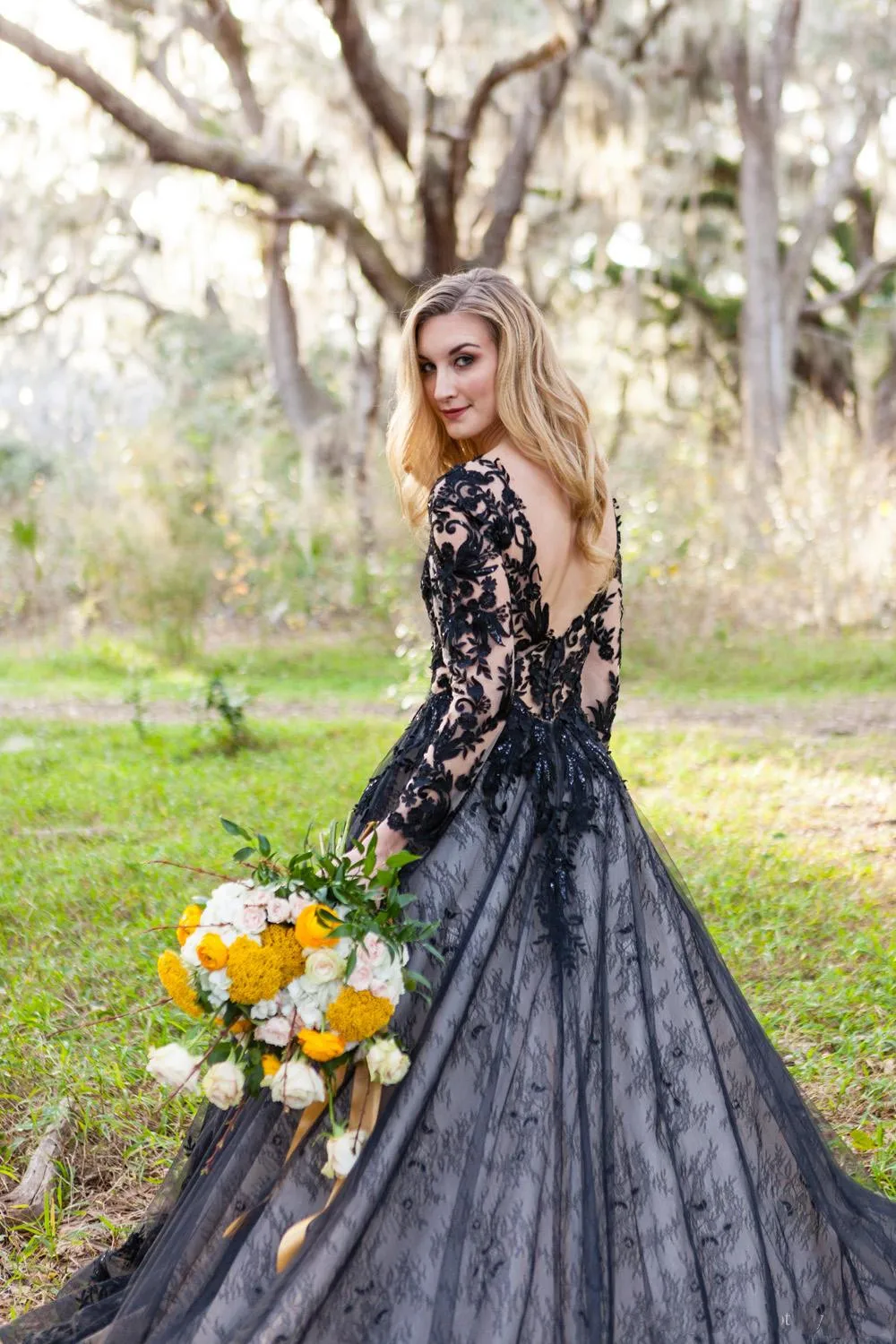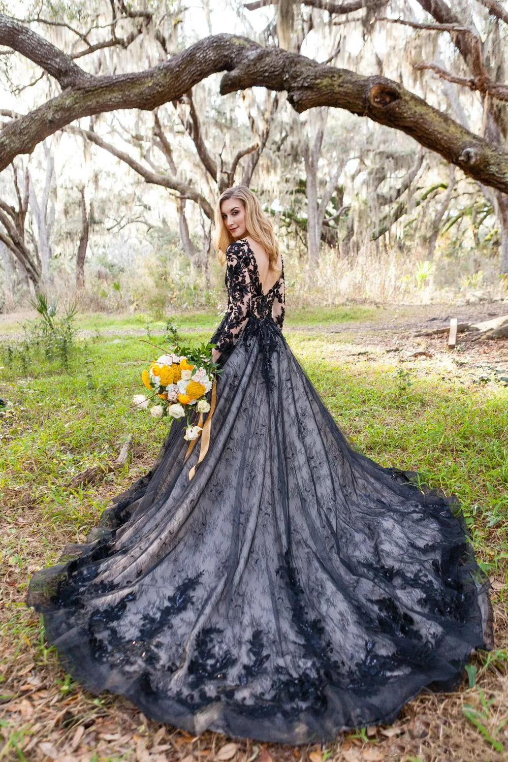 Женское кружевное свадебное платье, готическое черное ТРАПЕЦИЕВИДНОЕ ПЛАТЬЕ с длинными рукавами и глубоким V-образным вырезом, нежно-белое платье невесты, индивидуальный пошив