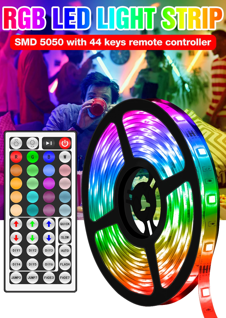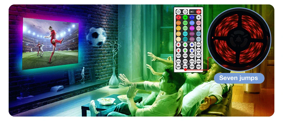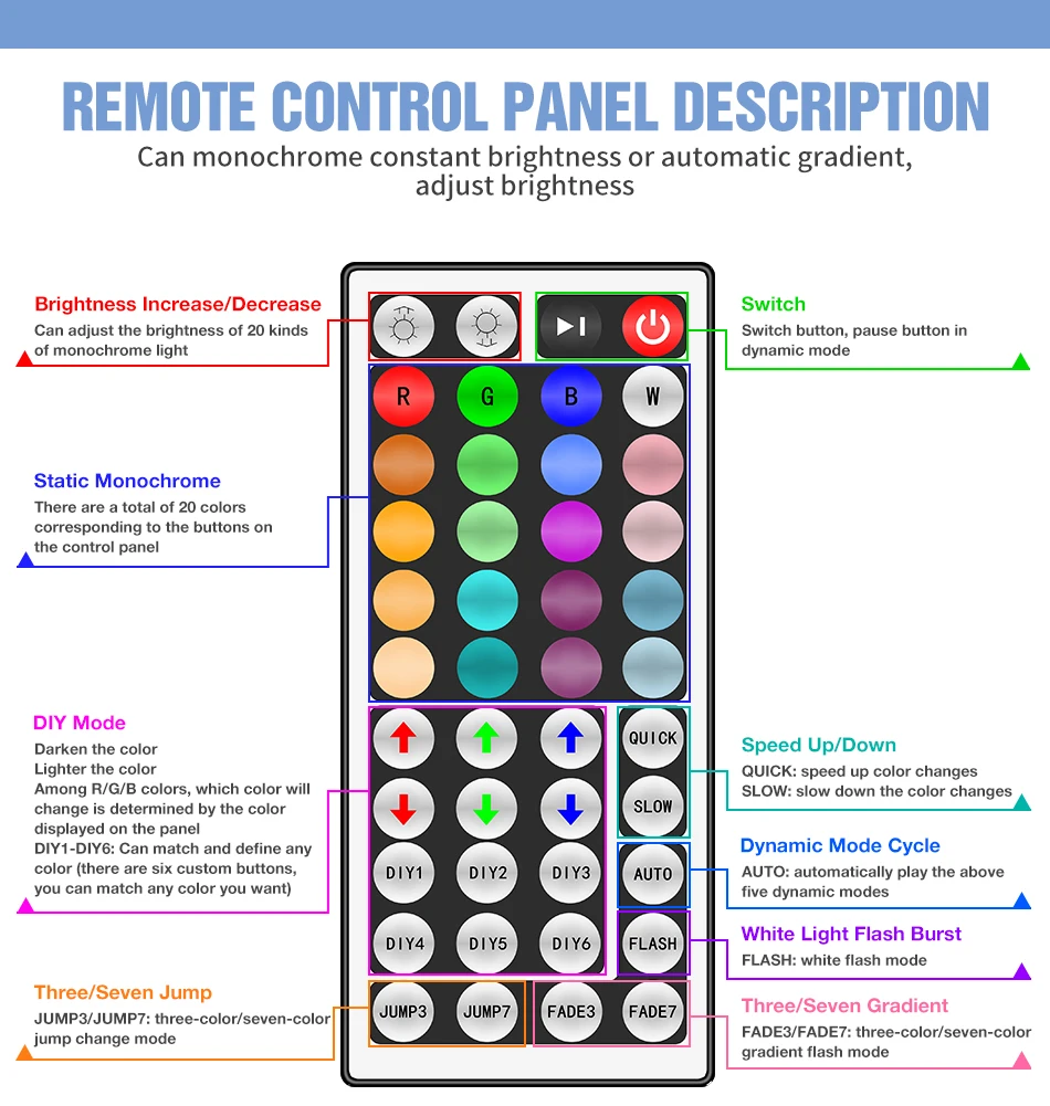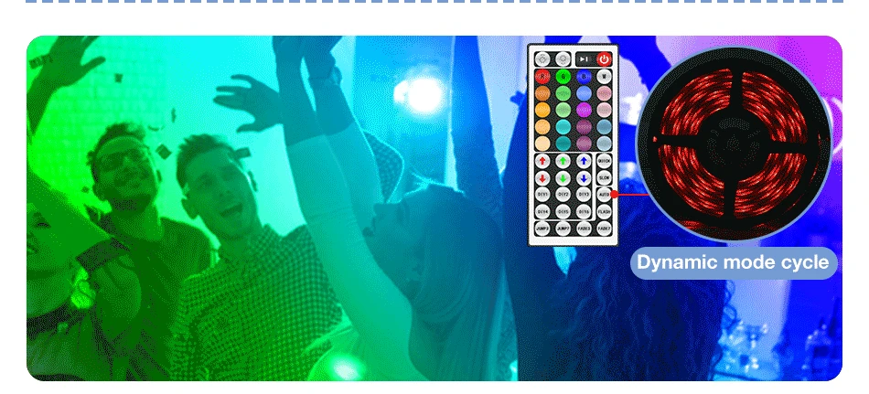 * Применение 44-кнопочного пульта дистанционного управления для регулировки яркости цвета, различные цветовые режимы.