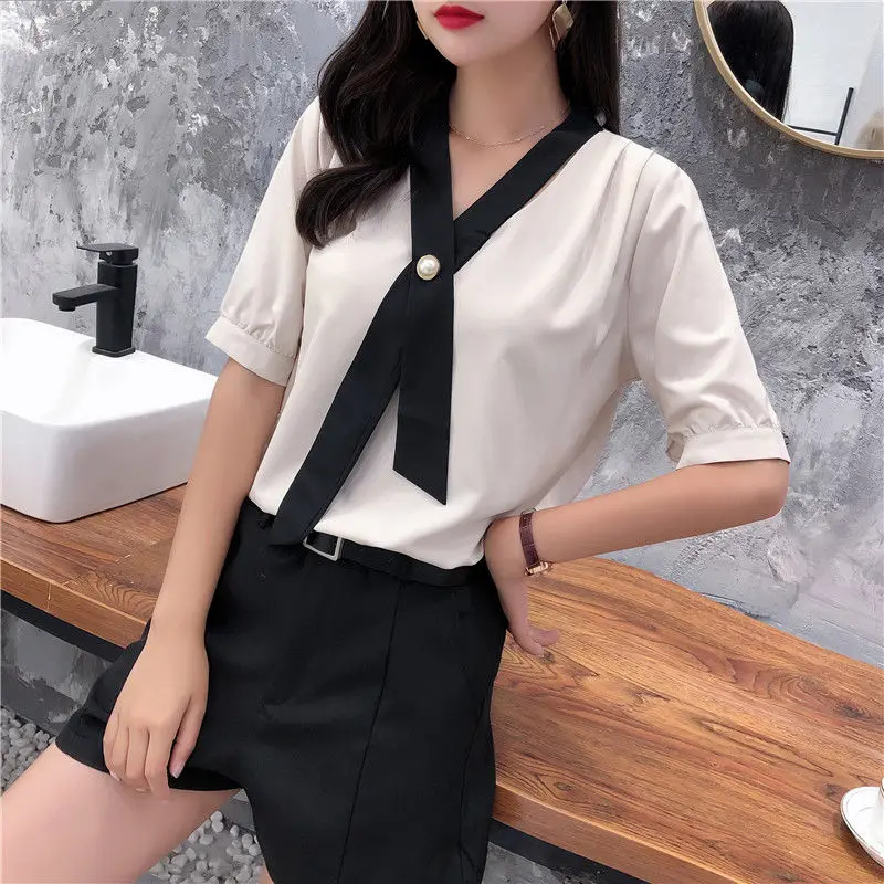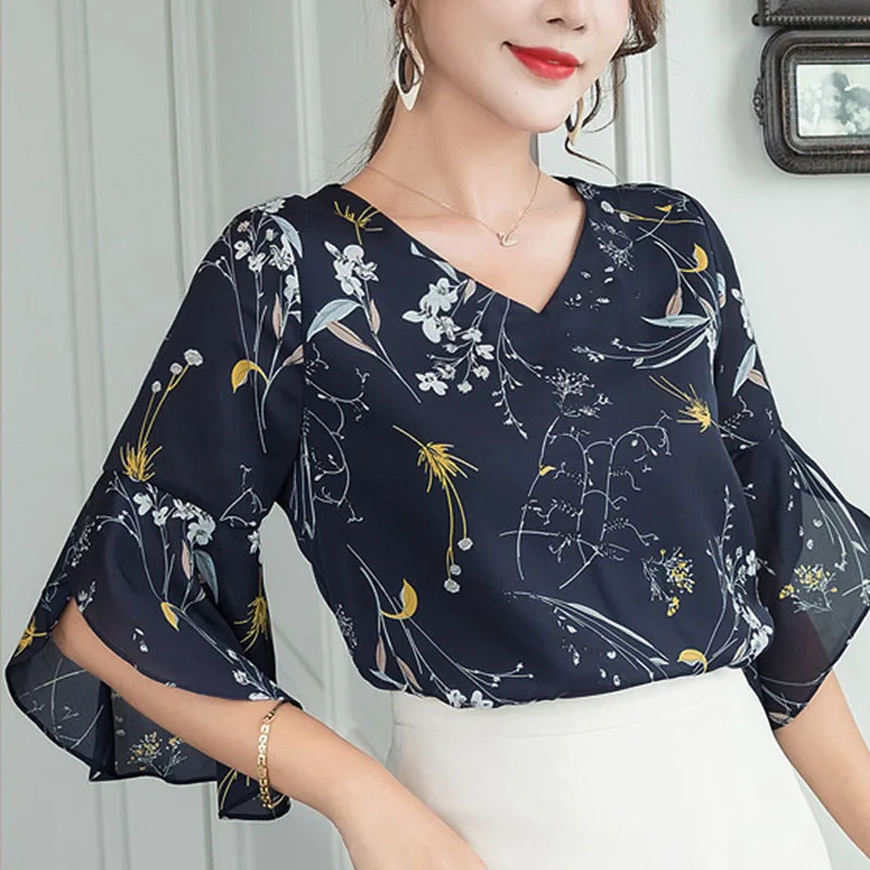 Женская летняя обувь Стиль с v-образным вырезом с цветочным принтом Блузки RibbonFish с коротким Расклешенным рукавом Рубашки женские повседневные галстук-бабочка, Blusas