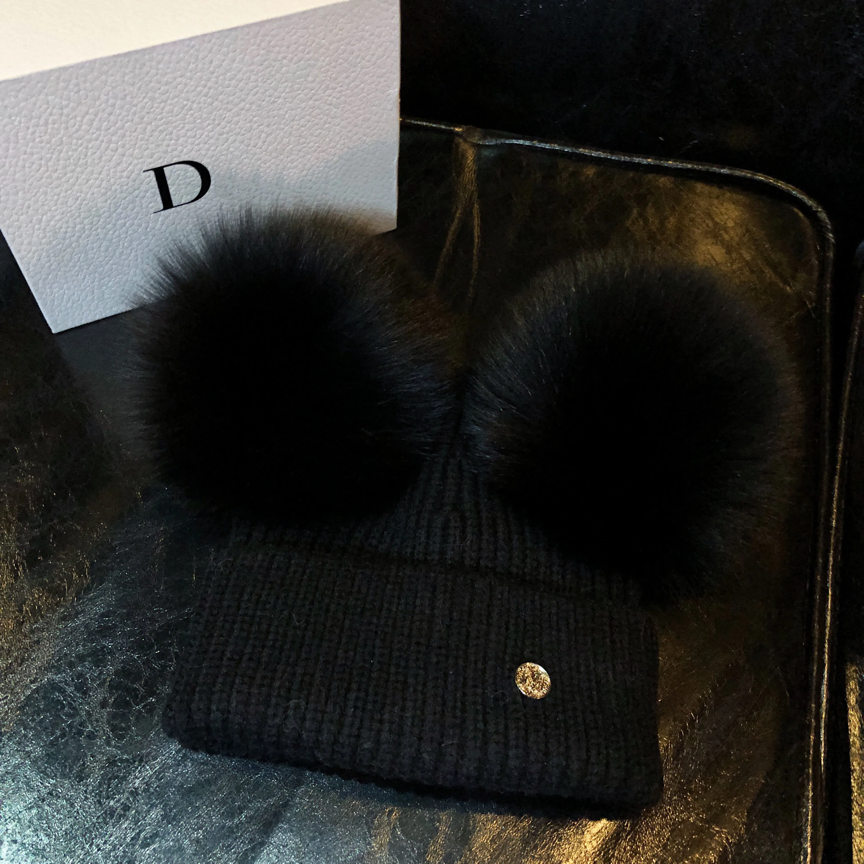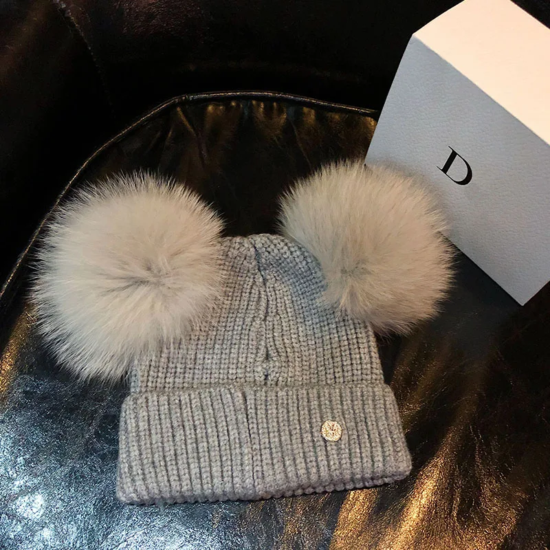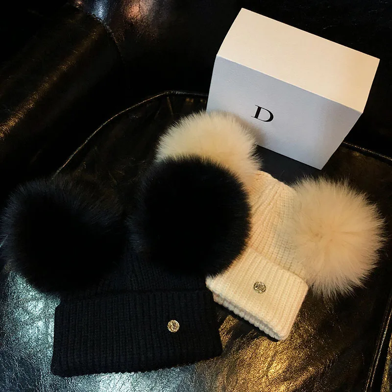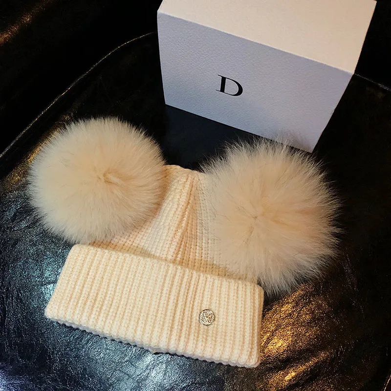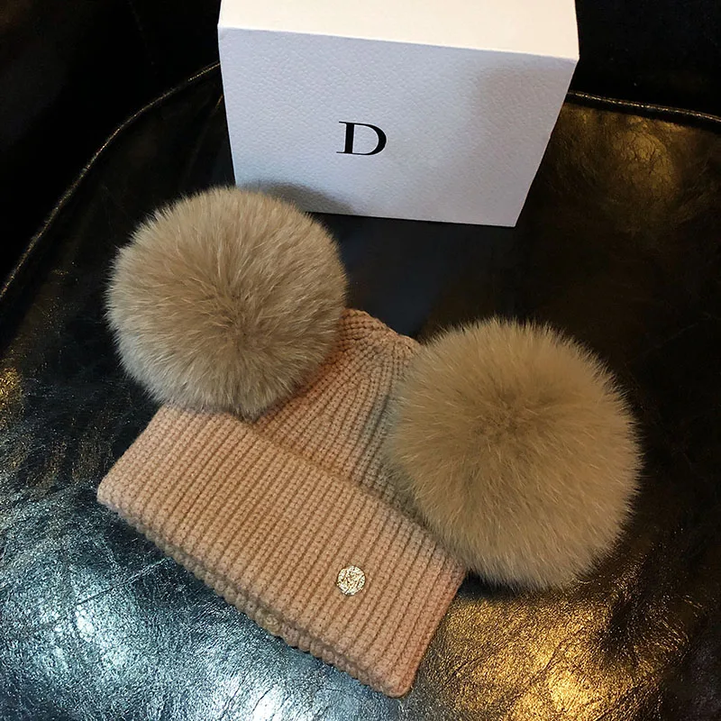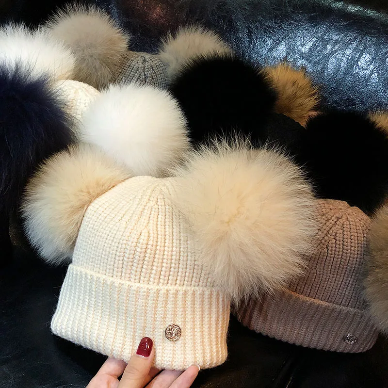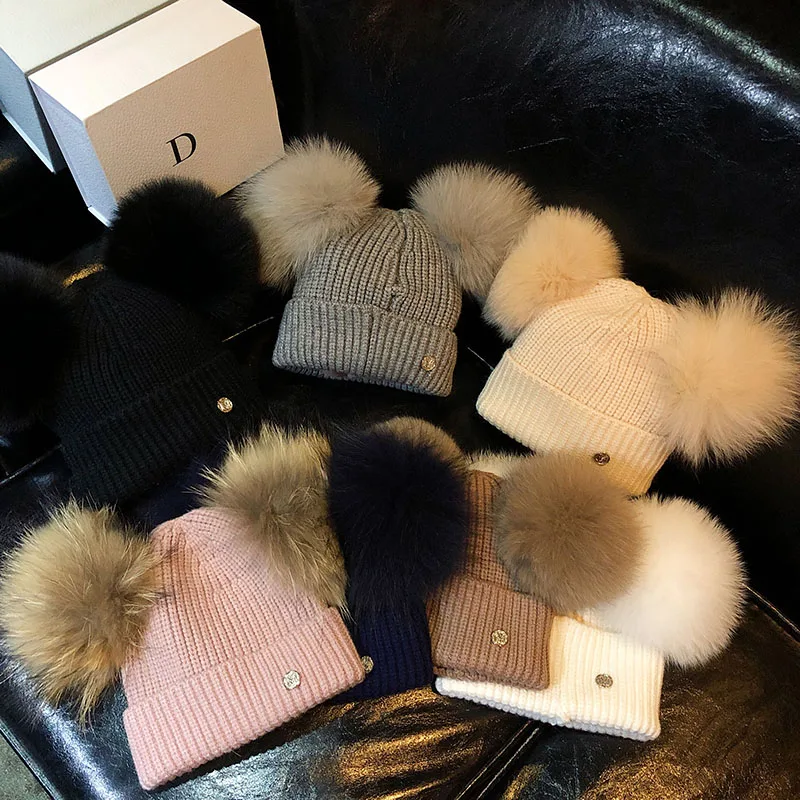 HT021 брендовая зимняя шапка для взрослых 16 см шапка с двумя помпонами из натурального меха шапка для женщин вязаная шапка шапочки Женские шапки