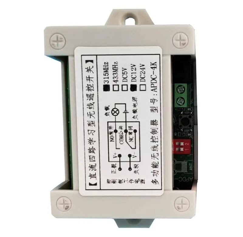 Характеристики:Управление огнями, телевизорами, двигателями, вентиляторами, камерами, видеосигналами, звуковыми сигналами, электрически управляемыми дверями/замками/окнами.1) Рабочее напряжение: DC12V/24V ± 10%2 рабочих тока: ≤ 180ма3. Статический ток: ≤ 10 мАРабочая температура: -10 ~ + 70 ℃Чувствительность приема: -109 дБм6 рабочих частот: 315 МГц/433,92 МГц, если нет сообщения, мы отправим 315 МГц7. Размер контроллера: 75,0 мм x 57,8 мм x 20,0 мРежим работы: пробежка, самоблокировка и блокировкаТип кодирования: код обученияДобавить передатчик с помощью кнопки обучения на приемникеФункция разборки1) Режим пробежки: не набирайте переключатель кода2) Режим самоблокировки: переключатель кода циферблата 1,2 для самостоятельной блокировки3) Режим блокировки: переключатель кода циферблата 1 к ВКЛ для блокировки4) Режим самофиксации jog +: переключатель кода циферблата 2 в ВКЛ. for1,2 самофиксации; 3,4 jog800-7Методы обучения:Нажмите кнопку обучения, светильник индикатора включен, затем нажмите кнопку передачи дистанционного управления, светильник s мигает означает успех обучения, пульт дистанционного управления может быть использован.Способ очистки:Нажмите кнопку обучения около 10 секунд, пока светильник не погаснет.