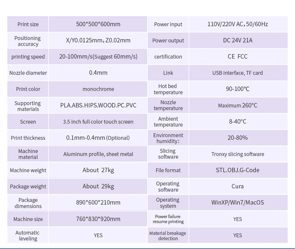 Размер печатной модели: 500 мм * 500 мм * 600 ммОбратите внимание:Сложный процесс сборки был завершен до выхода из фабрики, но Принтер должен быть просто собран, чтобы объединить собранные детали.