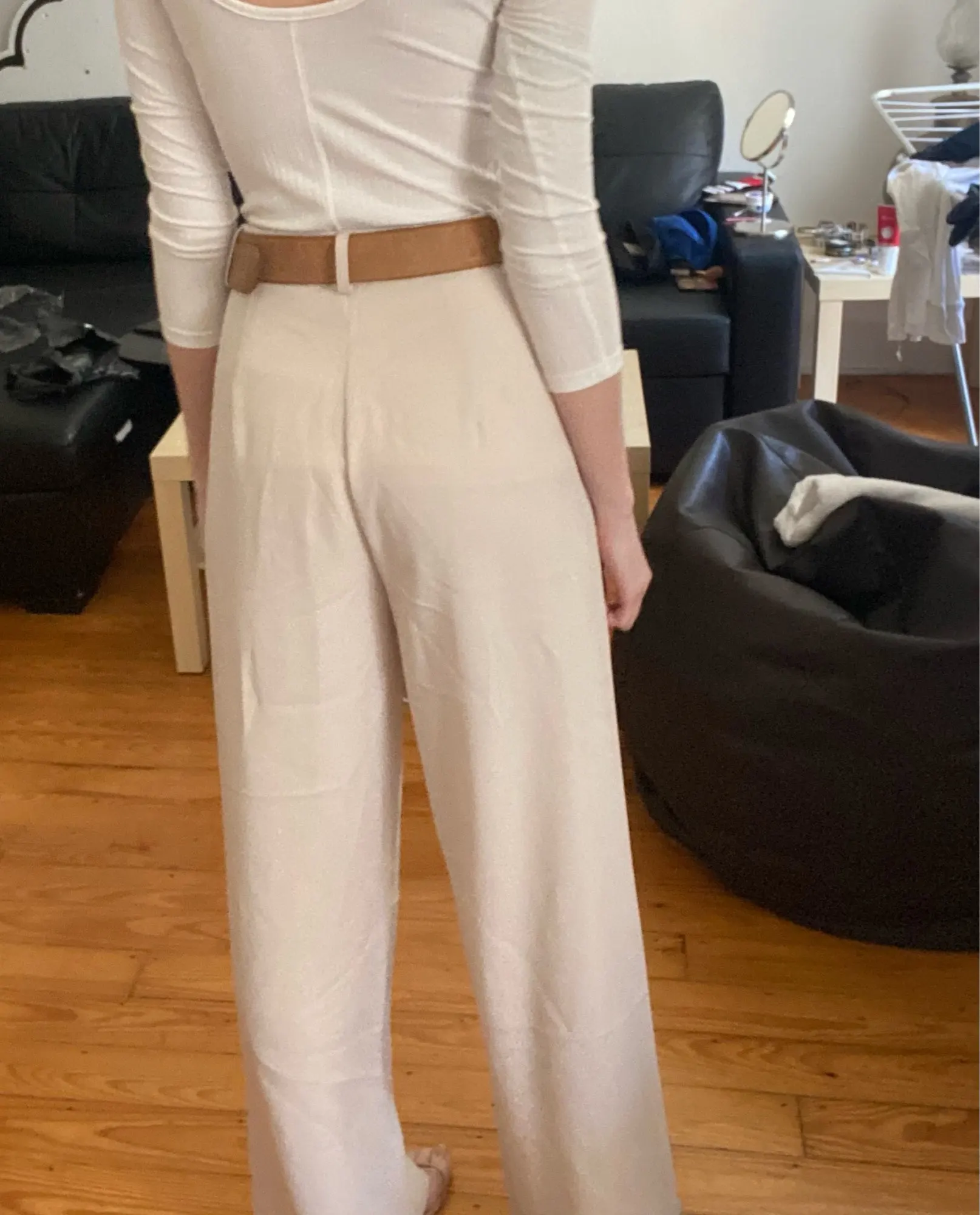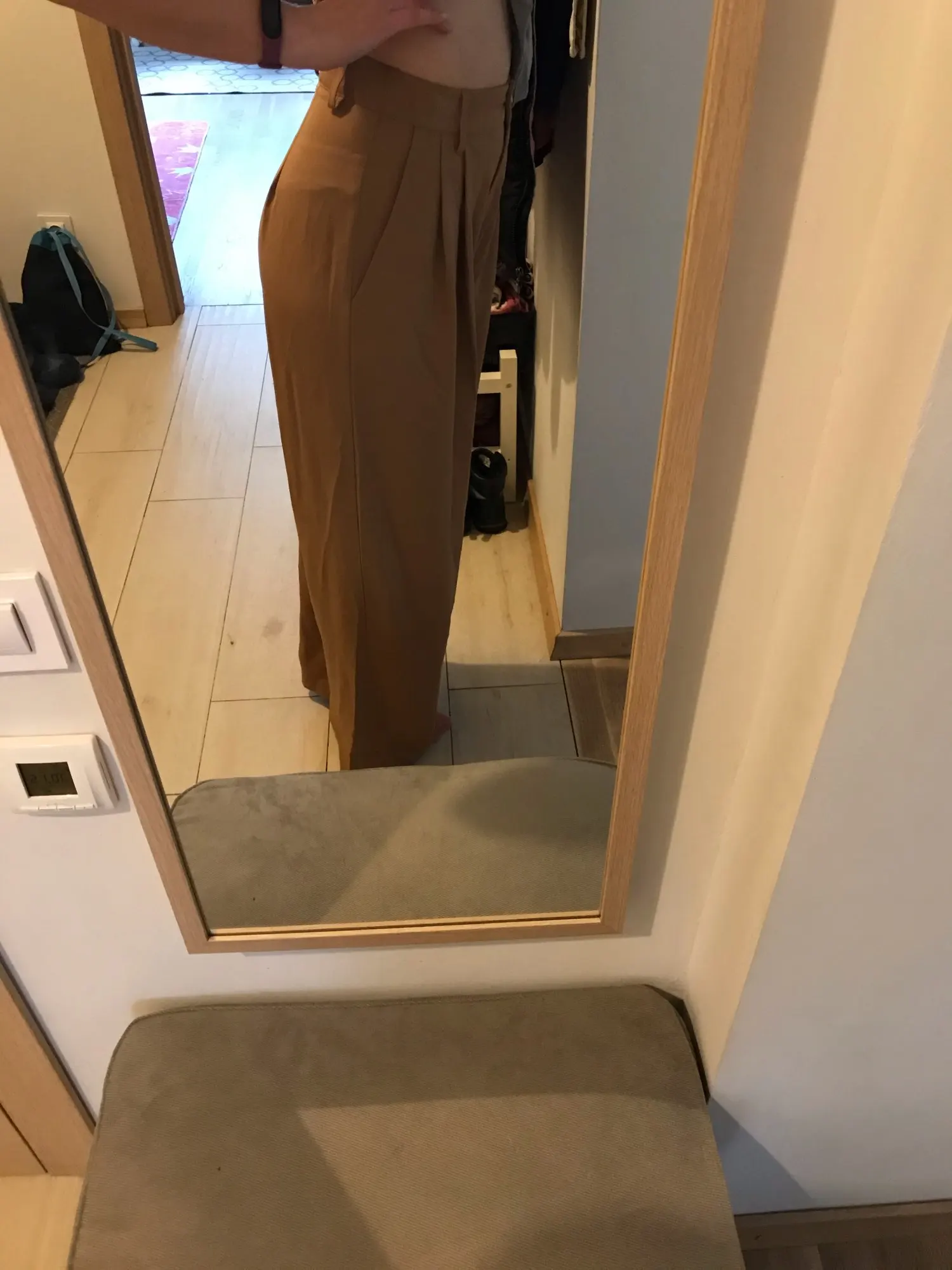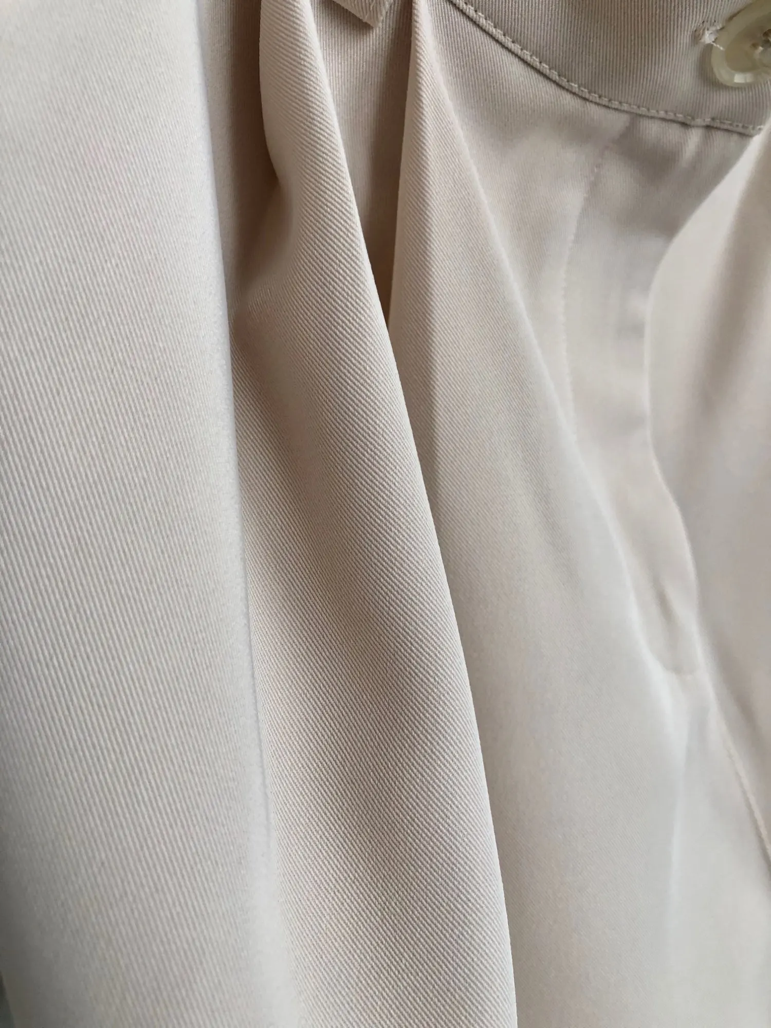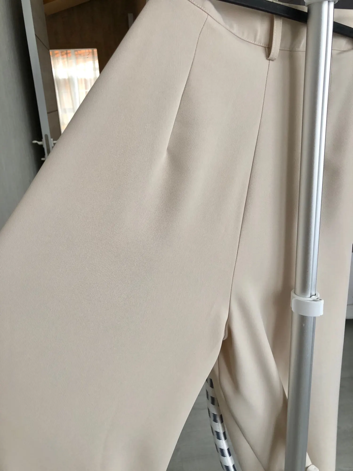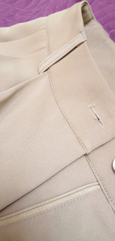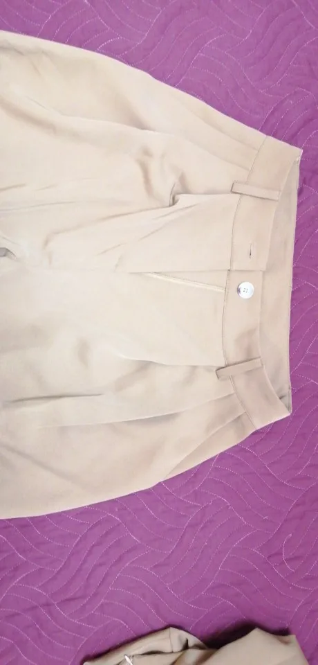 отличные брюки, хорошее качество. ткань тонкая, но тяжёлая. цвет тёплый беж, немного с рыжинкой. на ОТ76 и ОБ103 сели идеально, но без запаса в талии. имейте в виду, что если ваши бедра шире, то можете не пролезть через талию. длина по внешнему шву вместе с поясом 111см, по внутреннему 80см.