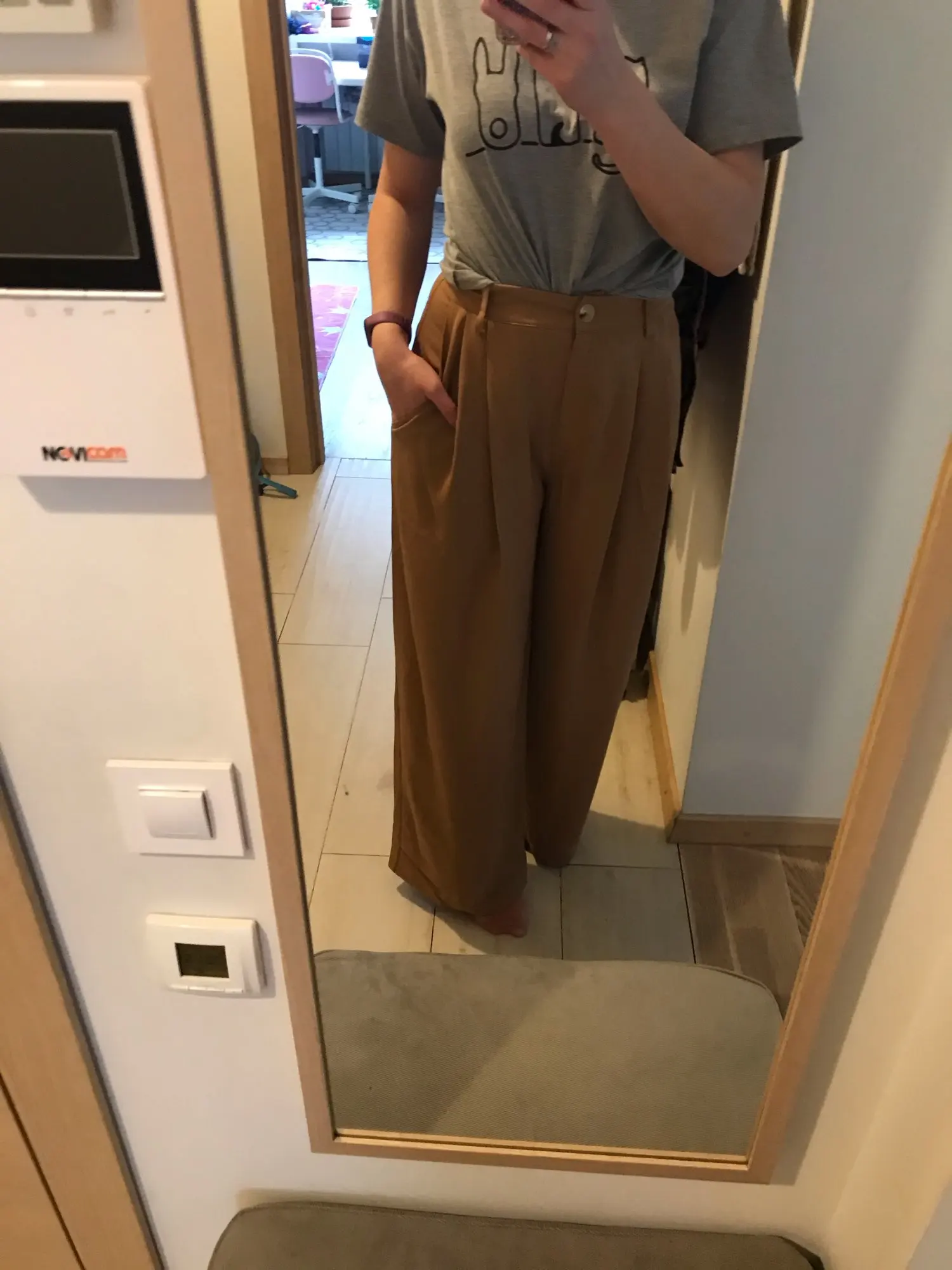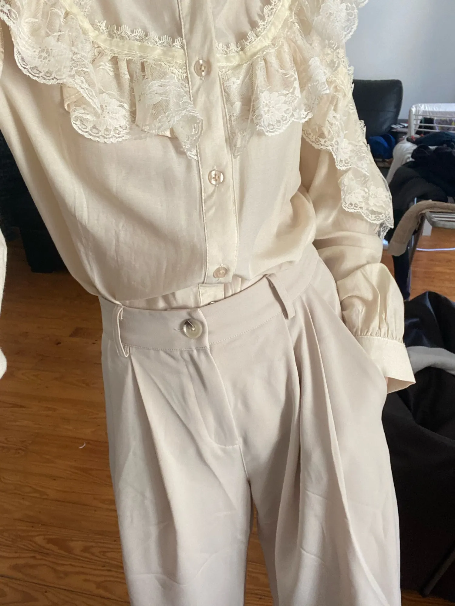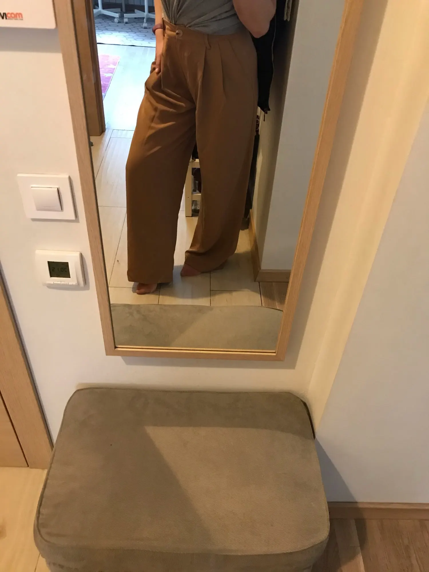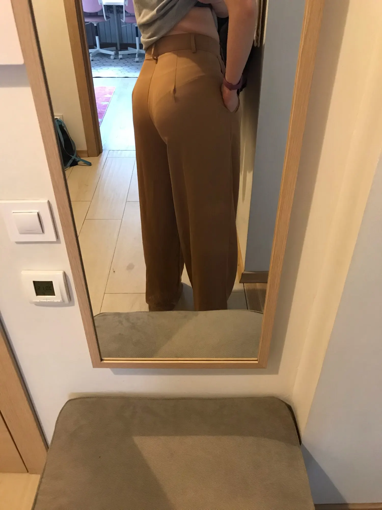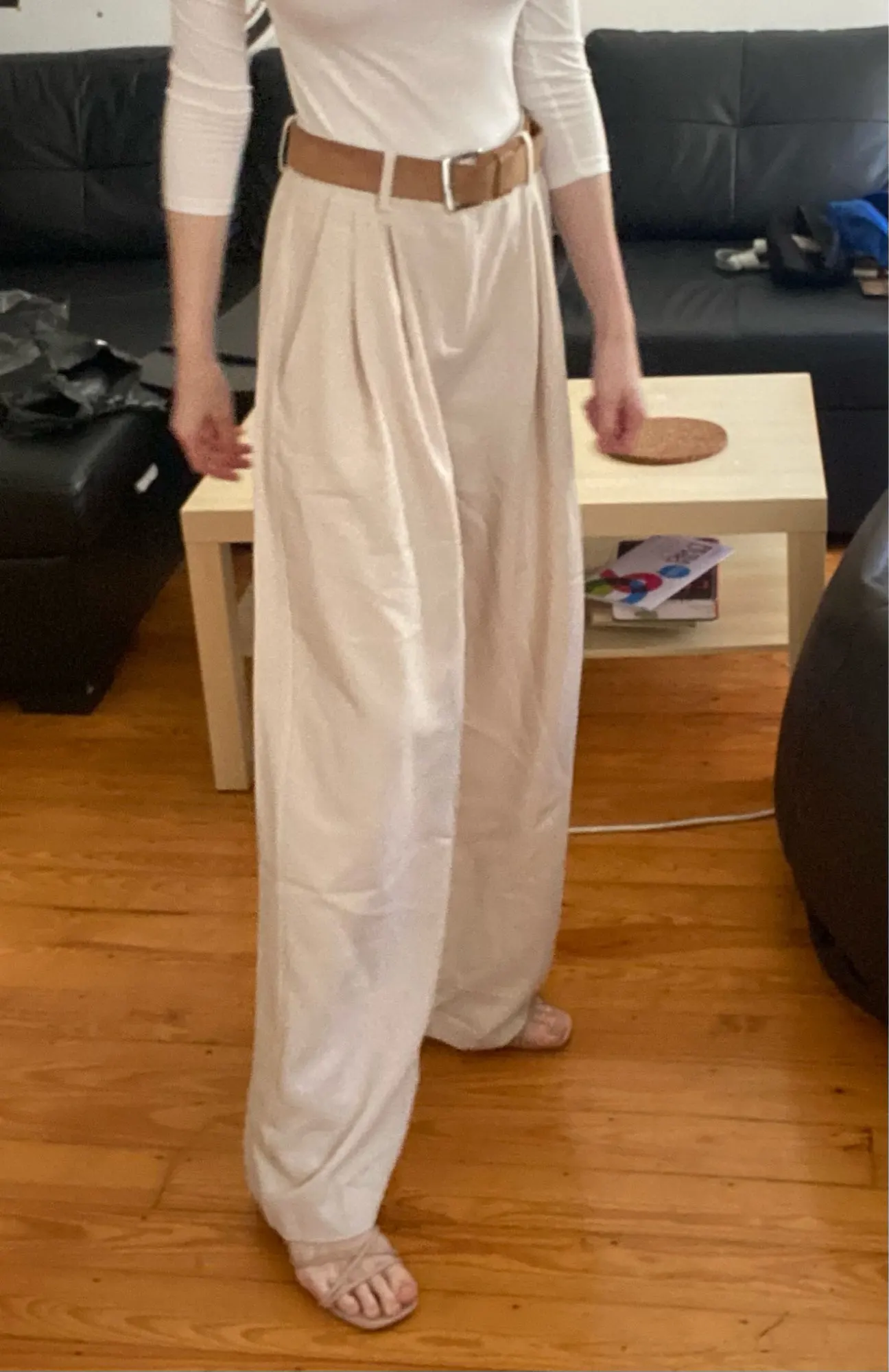 отличные брюки, хорошее качество. ткань тонкая, но тяжёлая. цвет тёплый беж, немного с рыжинкой. на ОТ76 и ОБ103 сели идеально, но без запаса в талии. имейте в виду, что если ваши бедра шире, то можете не пролезть через талию. длина по внешнему шву вместе с поясом 111см, по внутреннему 80см.