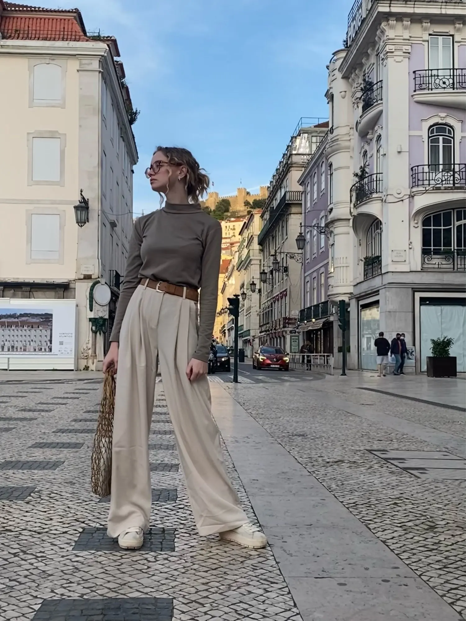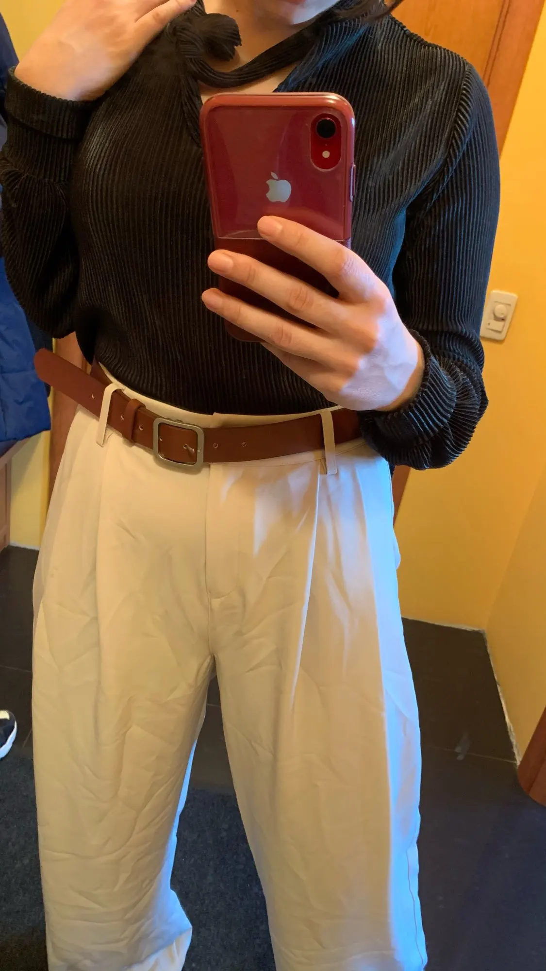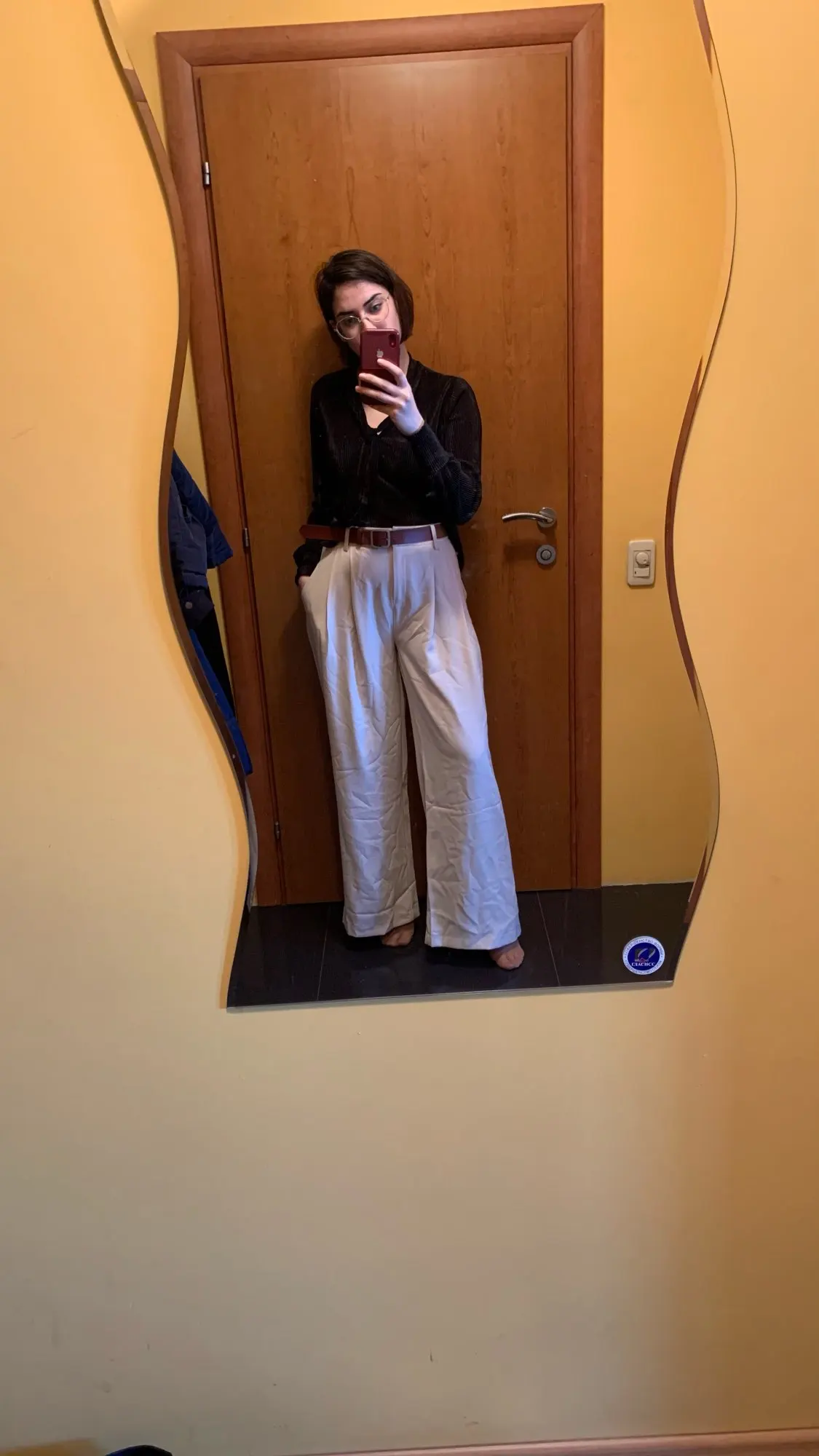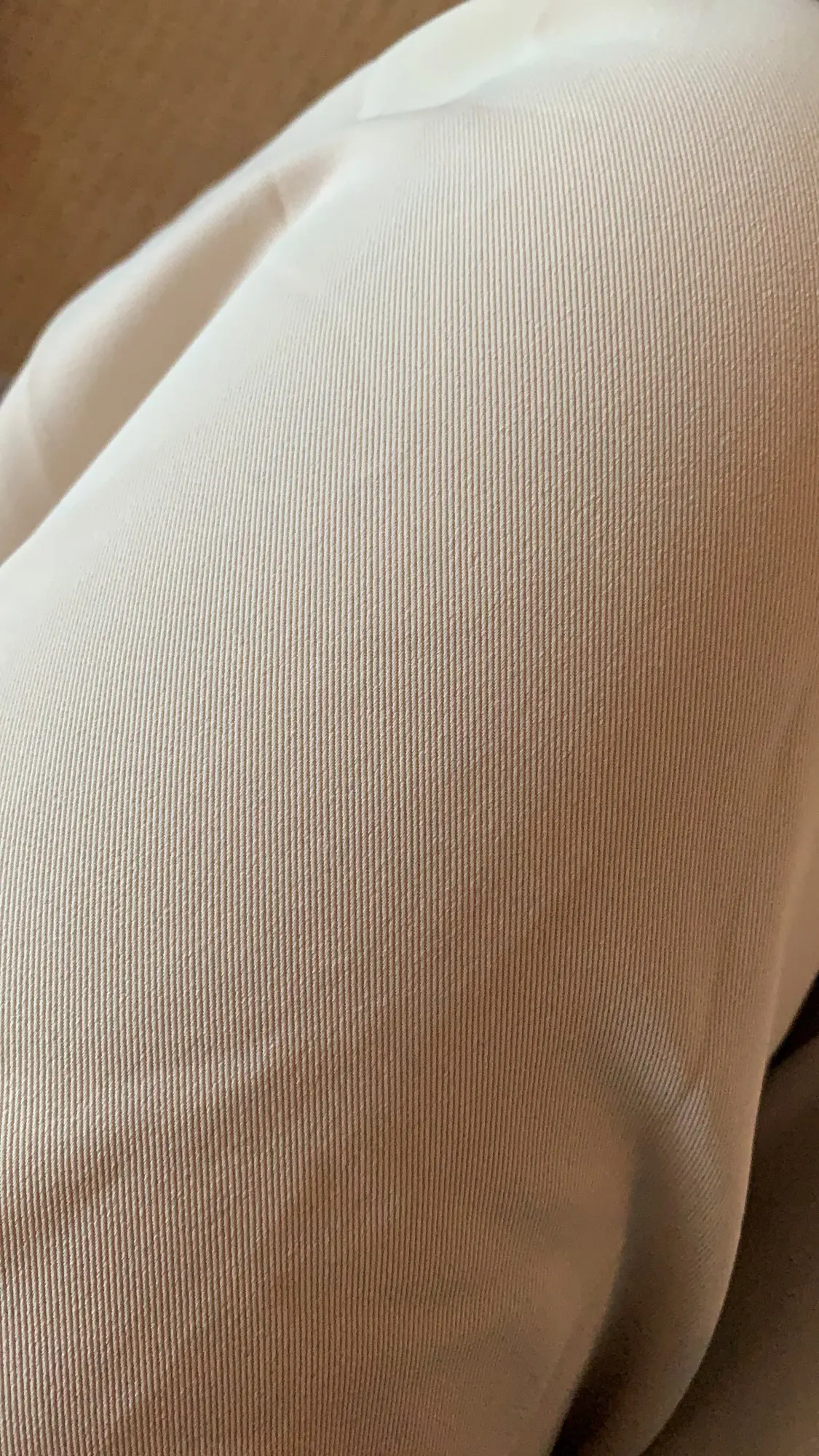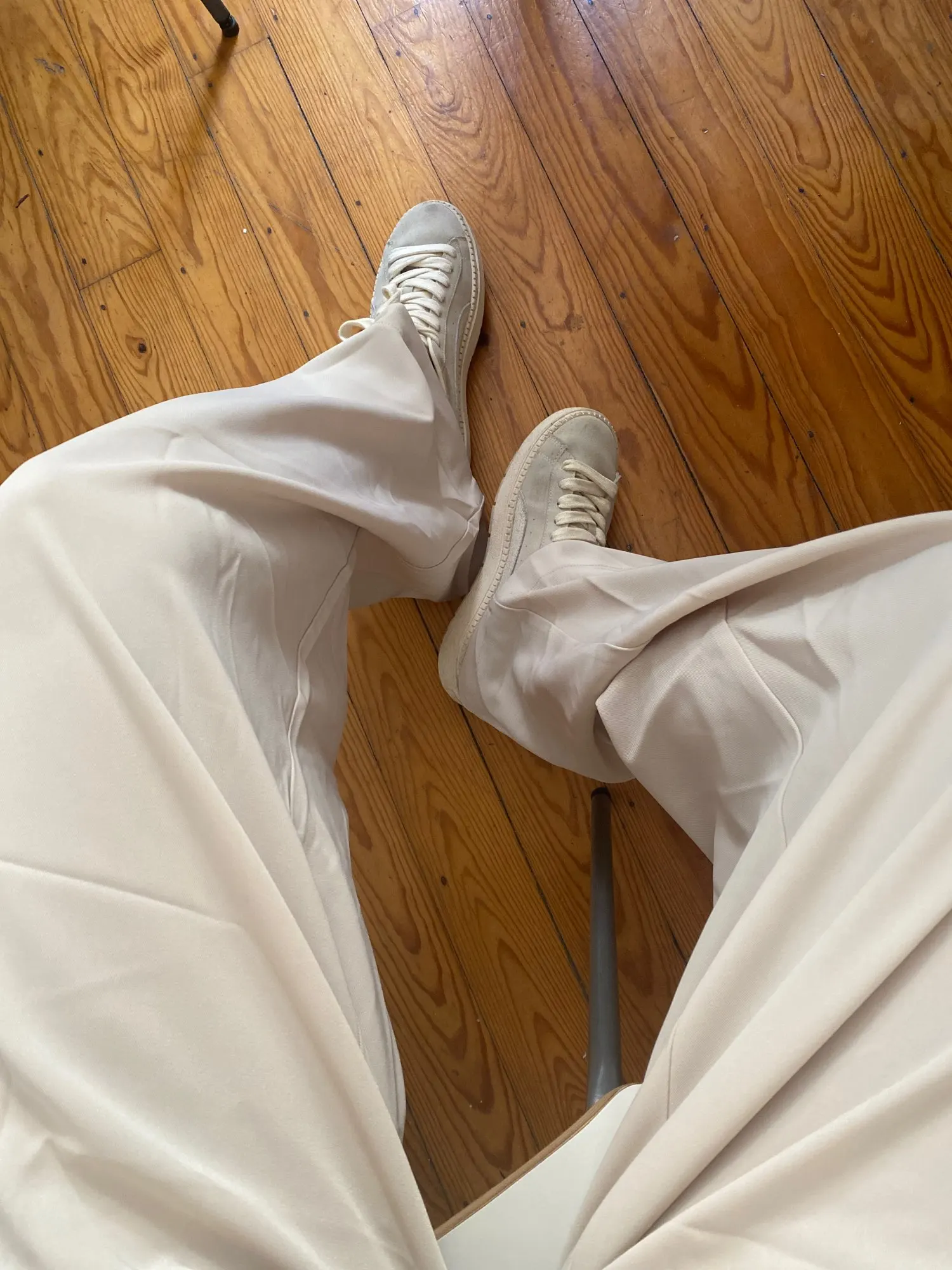 отличные брюки, хорошее качество. ткань тонкая, но тяжёлая. цвет тёплый беж, немного с рыжинкой. на ОТ76 и ОБ103 сели идеально, но без запаса в талии. имейте в виду, что если ваши бедра шире, то можете не пролезть через талию. длина по внешнему шву вместе с поясом 111см, по внутреннему 80см.