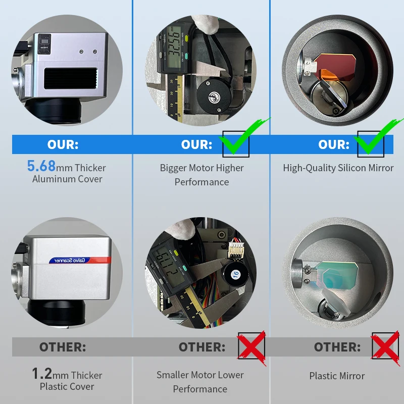 Быстрая скорость сканирующей головки цифрового гальванометра <9000 мм/секция. Благодаря бренду Focuslaser выбирается высокая скорость сканирования и точность. Мы также установили теплопередающий лист (красный), который выпустит тепло как можно скорее. Таким образом, чтобы получить лучшую производительность, убедитесь, что внутренняя температура головки сканера охлаждается быстрее.