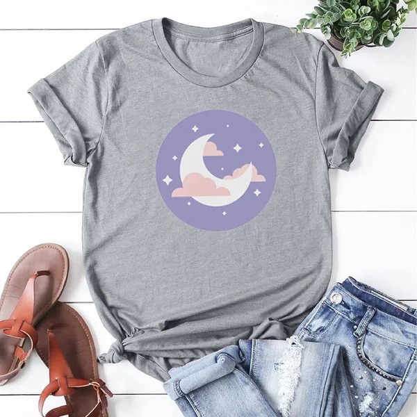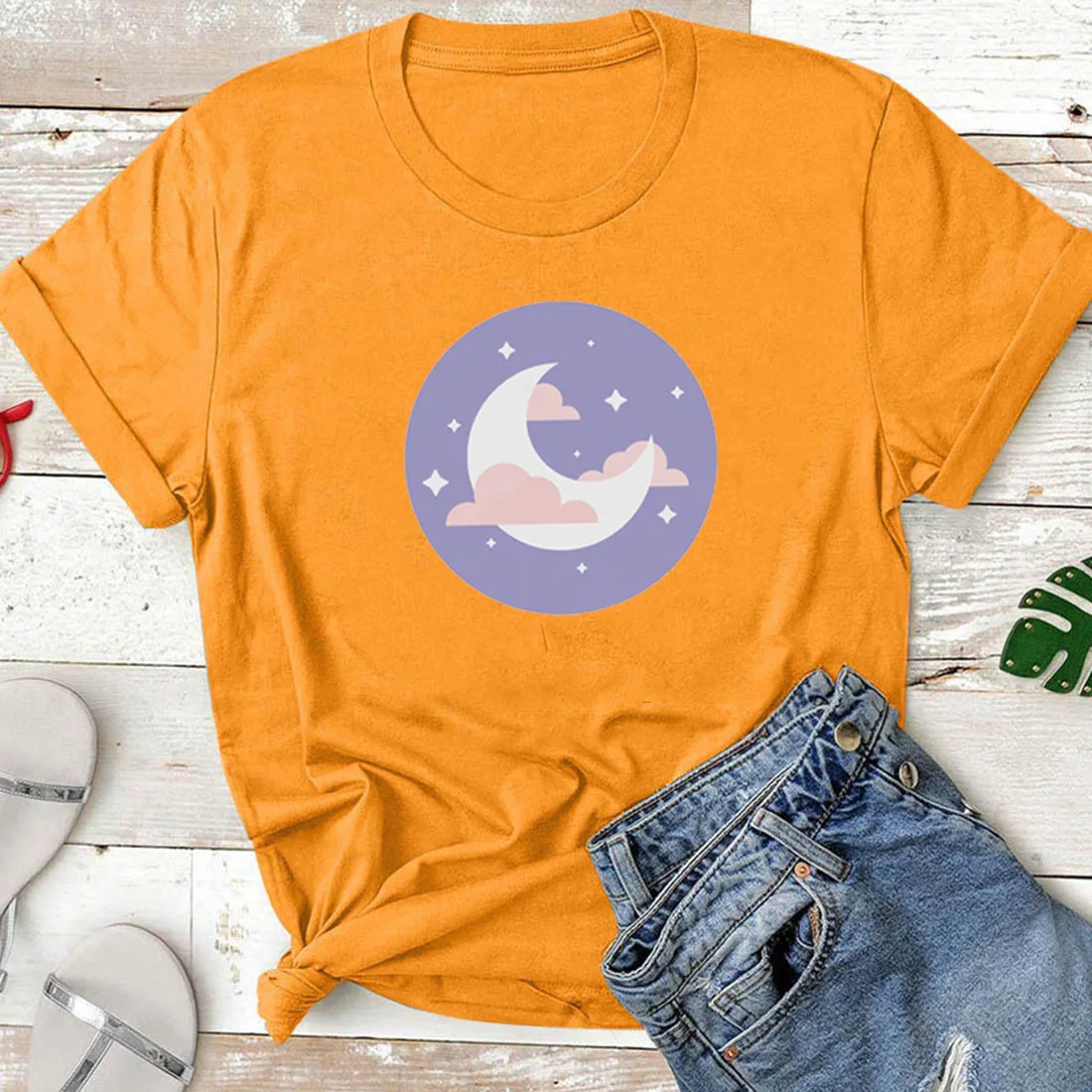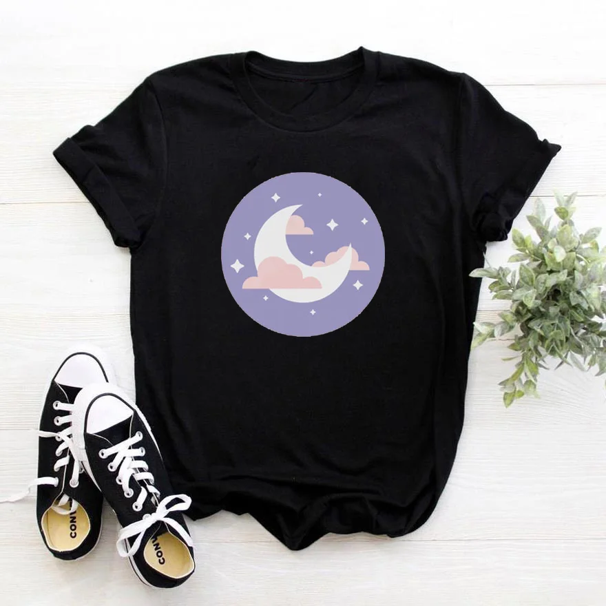 Звезды и луна шаблон Женская Повседневная футболка с принтом с О-образным вырезом Футболка Femme свободные Camiseta Mujer; Винтажный Стиль Забавный женская футболка Harajuku