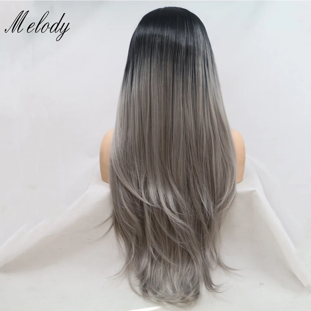 Мелодия длинные натуральные прямые серые синтетические u-образные кружевные передние парики с темным корнем для женщин термостойкие волокна волос