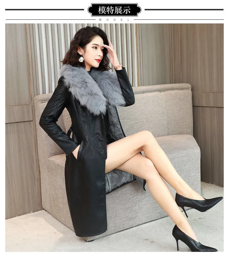 Женская кожаная куртка на зиму 2022, новое бархатное теплое облегающее длинное кожаное пальто с большим меховым воротником, женская верхняя одежда, зимние пальто