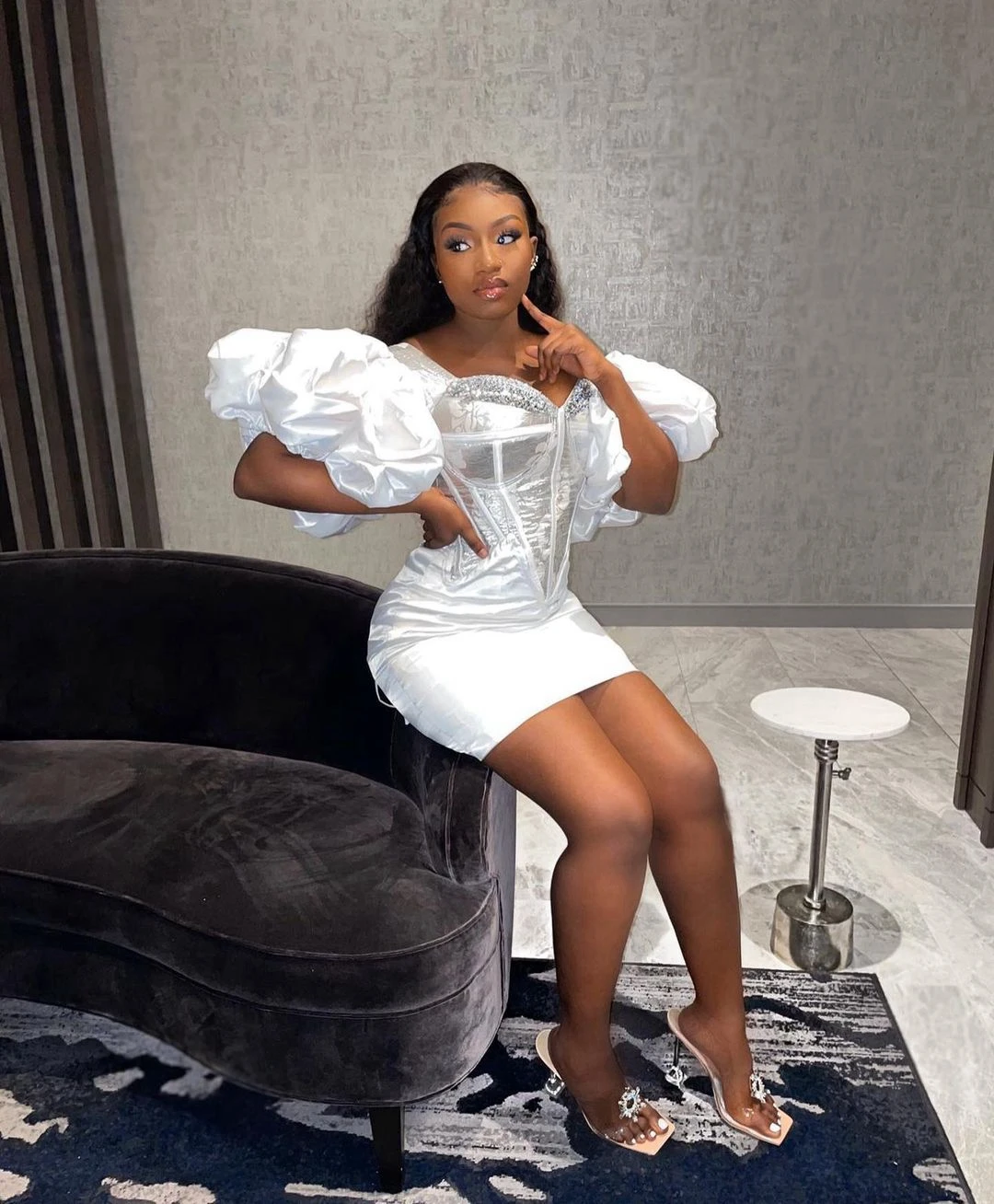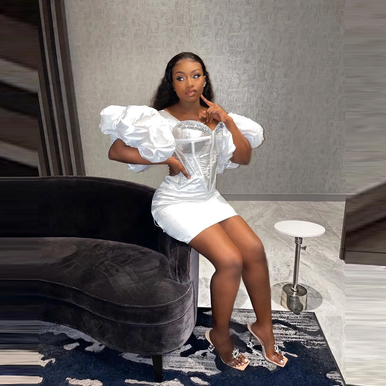 Платье мини вечернее, с пышными рукавами, с бисером, на молнии сзади