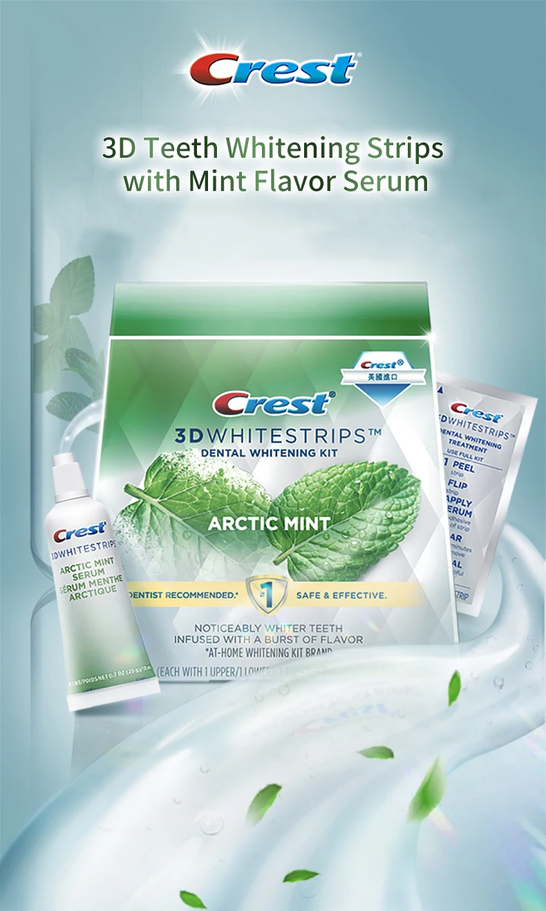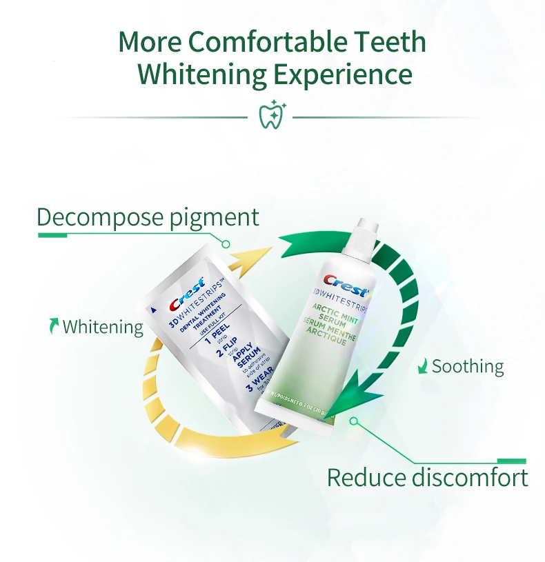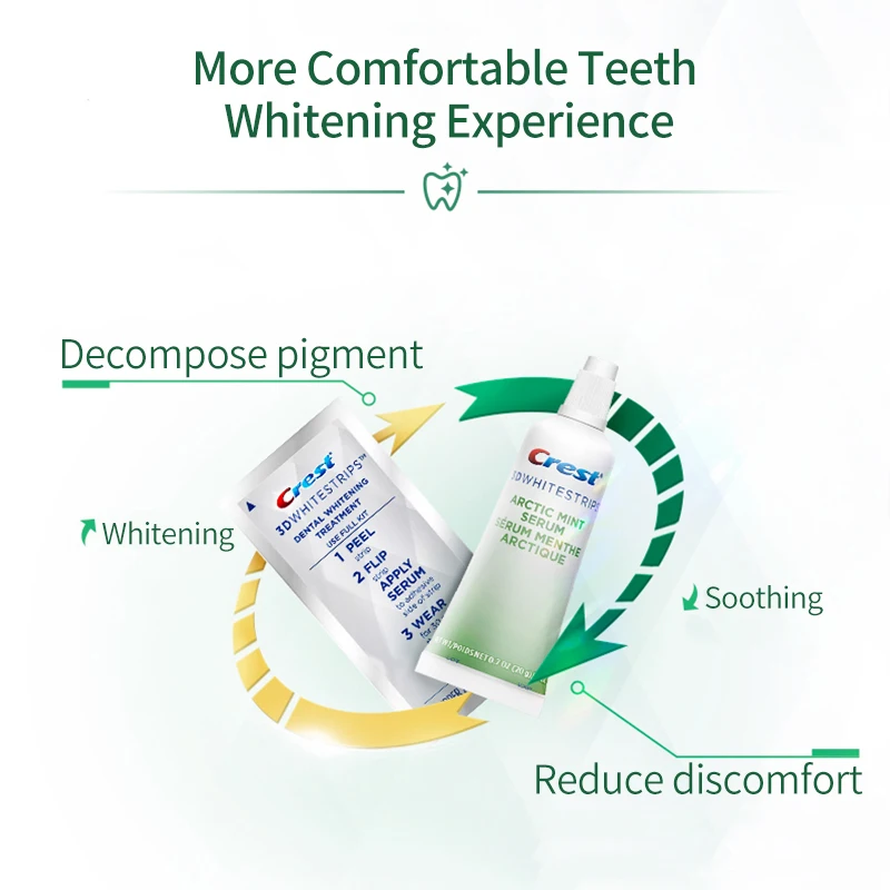 Комплектация: 16 мешков отбеливающих полосок для зубов (1 верхний и 1 Нижний в каждом мешочке), 1 тюбик сыворотки со вкусом мяты