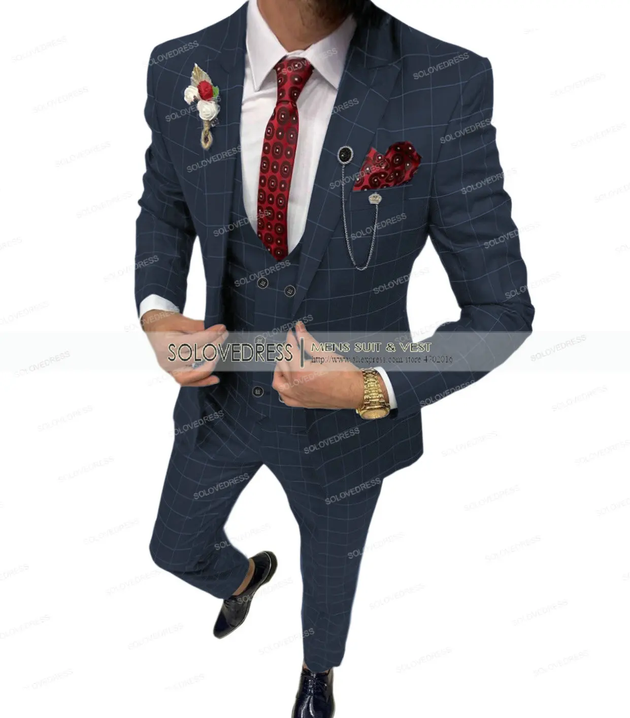 Мужской классический костюм из 3 предметов, бизнес формальный шерстяной смокинг в клетку с лацканами вечерние, свадеб, женихов, Блейзер, жилет и брюки