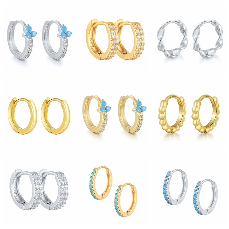 925 пробы, серебряные, бирюзовые, золотые серьги-кольца для женщин, кубический цирконий, Ювелирное Украшение, маленькие бусины, круглые серьги Huggie