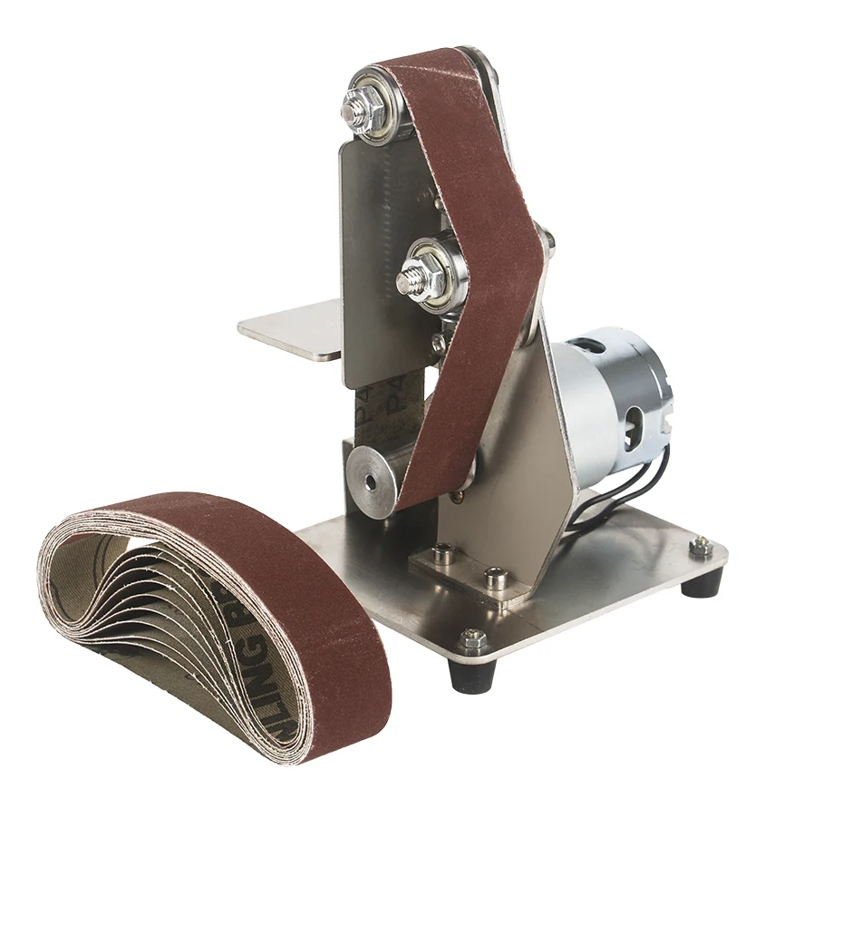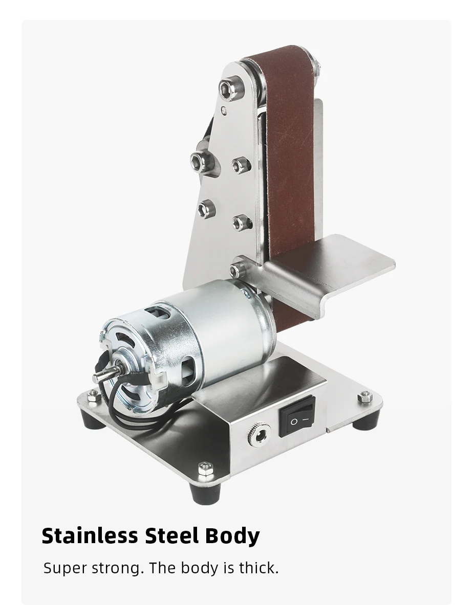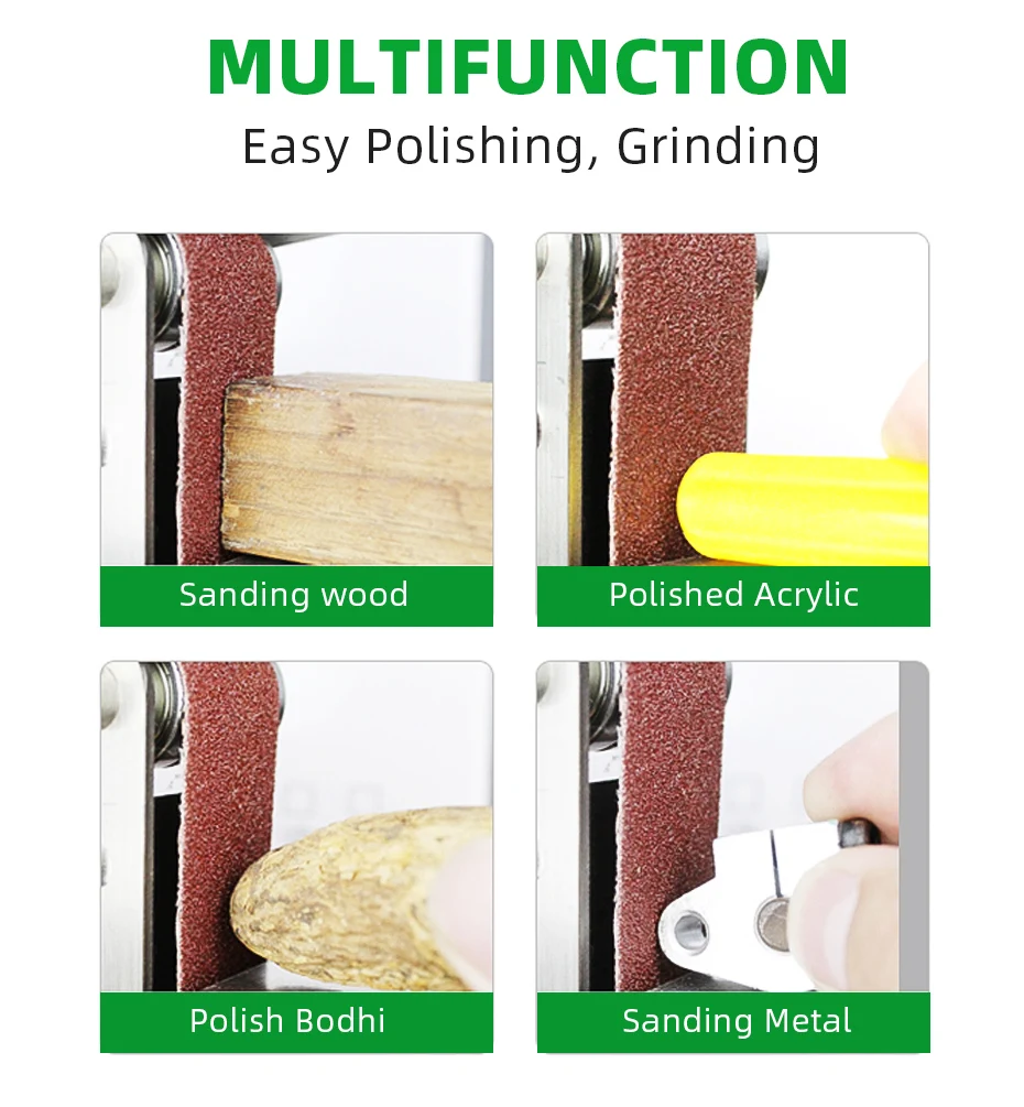 Особенность:-Встроенный Противоскользящий двойной подшипник, пыленепроницаемый-Тонкая работа, разумный дизайн и высокая точность.-Простой дизайн с использованием экологически чистого серебряного спрея.-Гибкий верстак, любой угол регулируется в центре.-Уникальная конструкция автоматической затяжки позволяет легко полировать.-2,0 утолщенный пол с использованием амортизаторов европейского стандарта, бесшумная устойчивость и более противоскользящее покрытие.Посылка1 ремень с регулируемой скоростью5X шлифовальная лентаГаечный ключ 5x1x адаптер