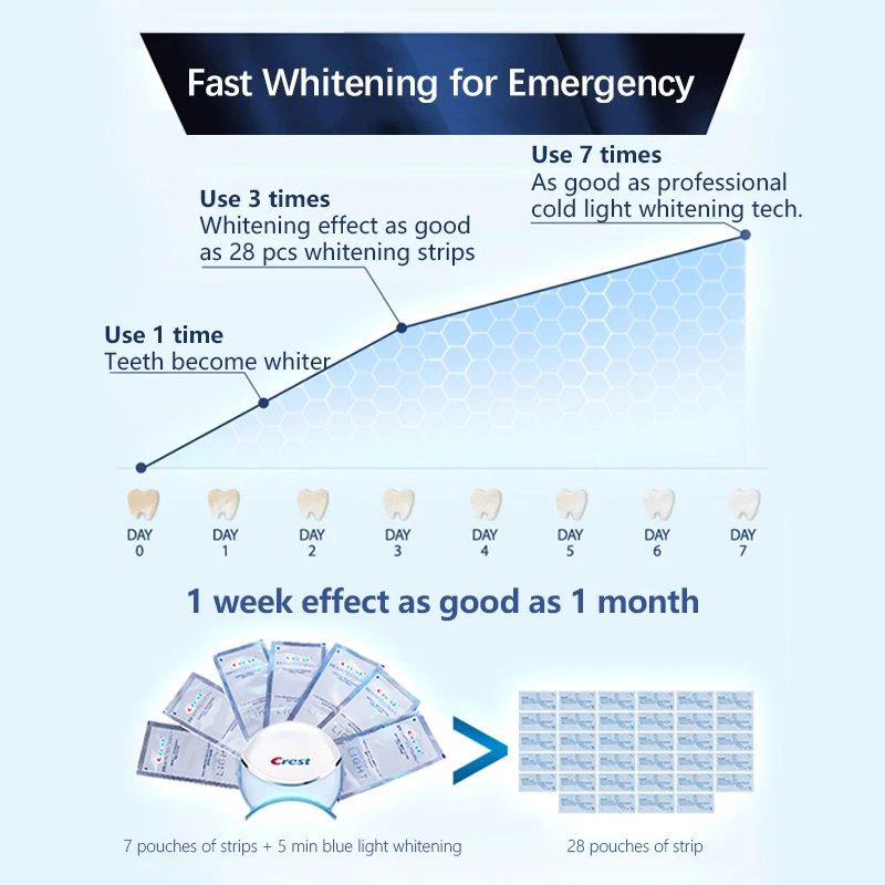 1. Лучшие и самые быстрые технологии отбеливания в доме2.Легкое, одноразовое, водостойкое, портативное устройство, которое ослабляет пятна3.При использовании в качестве направленного, Crest Whitestrips с светильник значительно лучше, чем только полоски4. Результаты отбеливания достигают 36 месяцев. Прикрепите светильник к верхним и нижним зубцам, пока он не выключается автоматически. Полные результаты за 10 дней5.1 светильник +7TПополненияПолоска для отбеливания зубовКаждая с 1 верхней и 1 нижней полоской. Применяется один раз в день в течение 60 минут