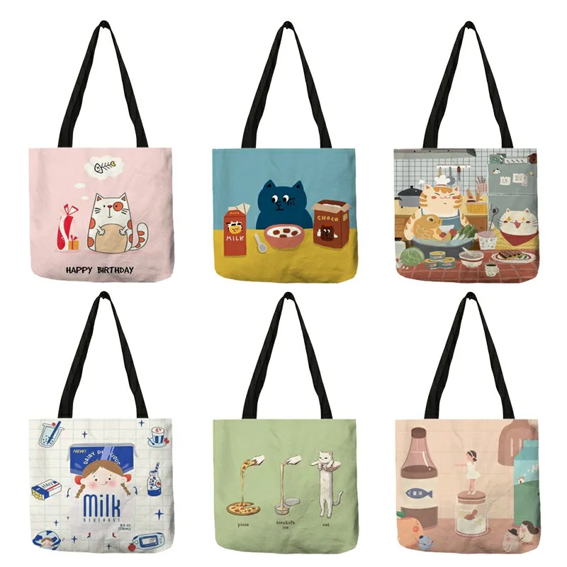 Повседневная Сумка-тоут Kawaii в японском стиле с рисунком кота и медведя, Льняная сумка, многоразовые сумки для покупок, пляжная сумка для улицы